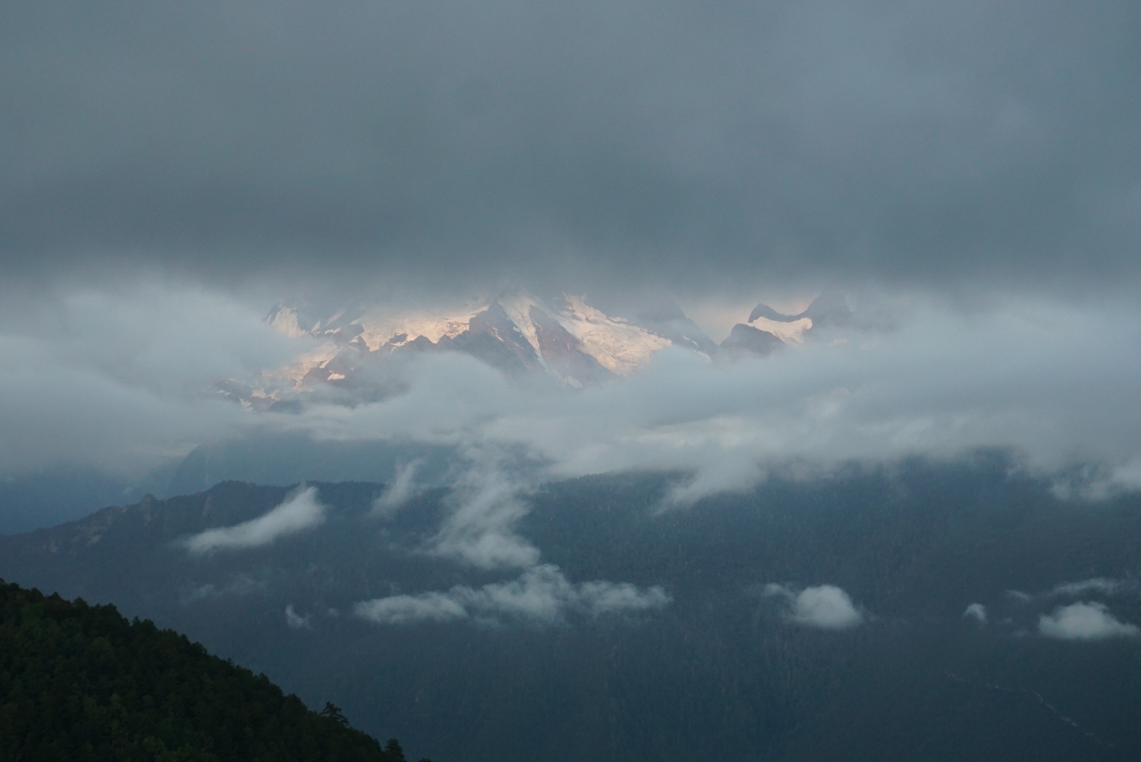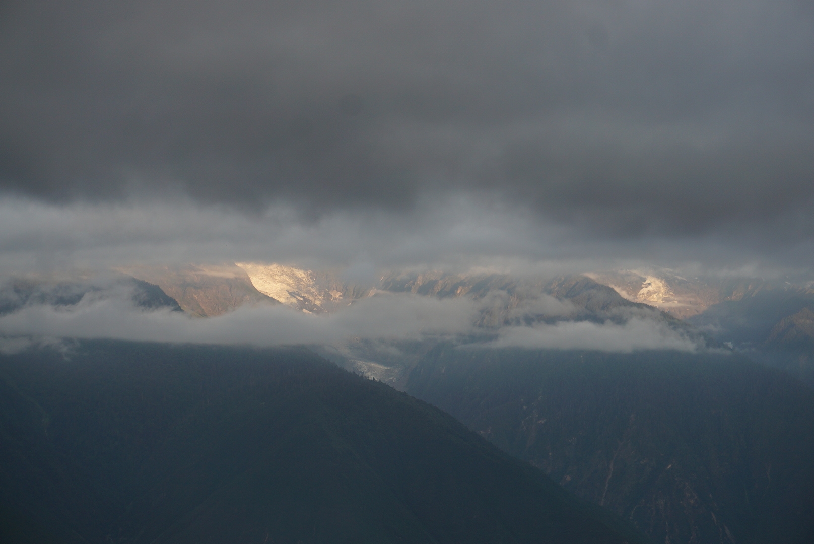 今天6点30就到观景台看日照金山了,很美的还是,虽然基本没有看到尊容,但是淡淡金光橘色能看到在雪山上。