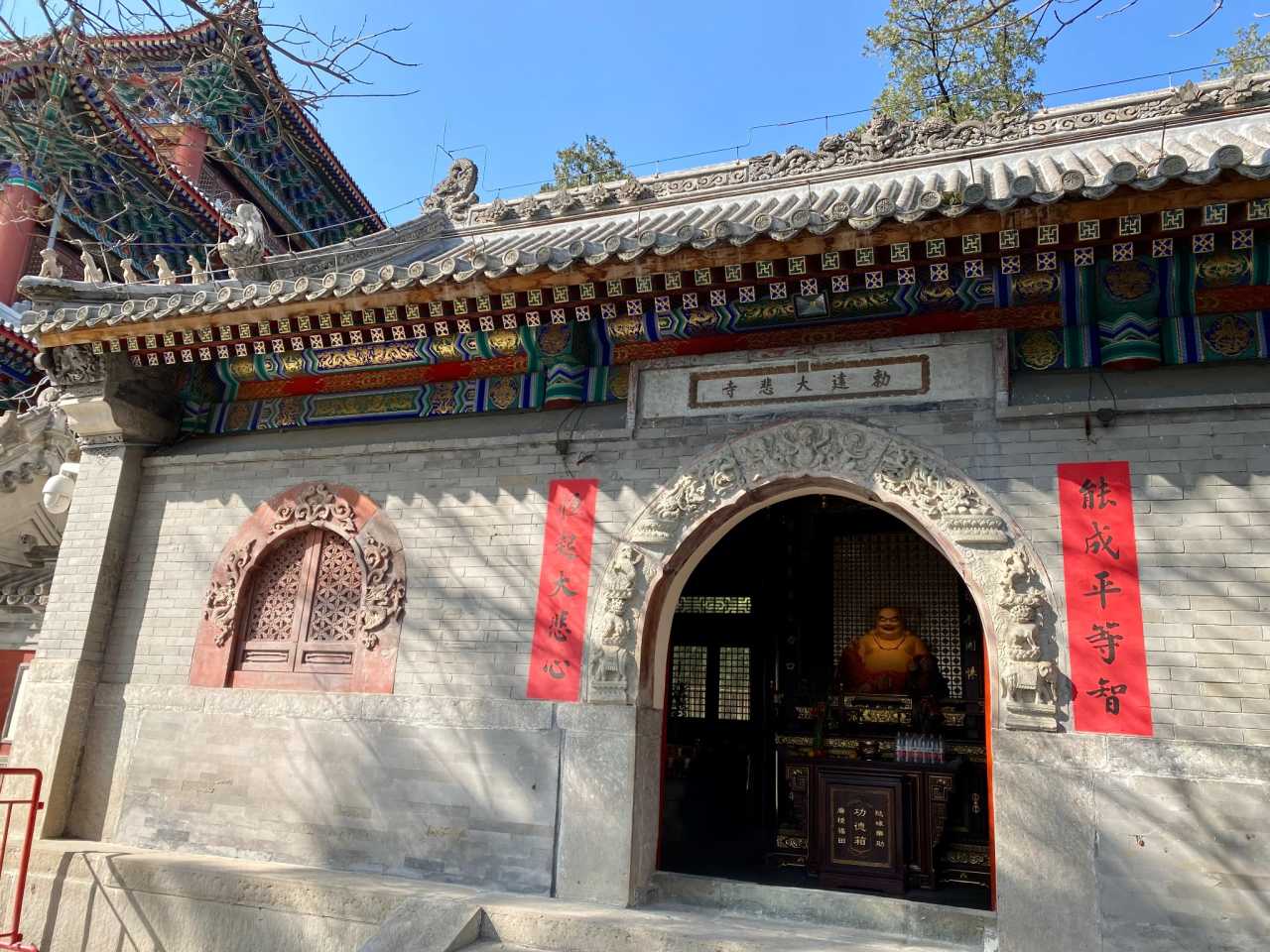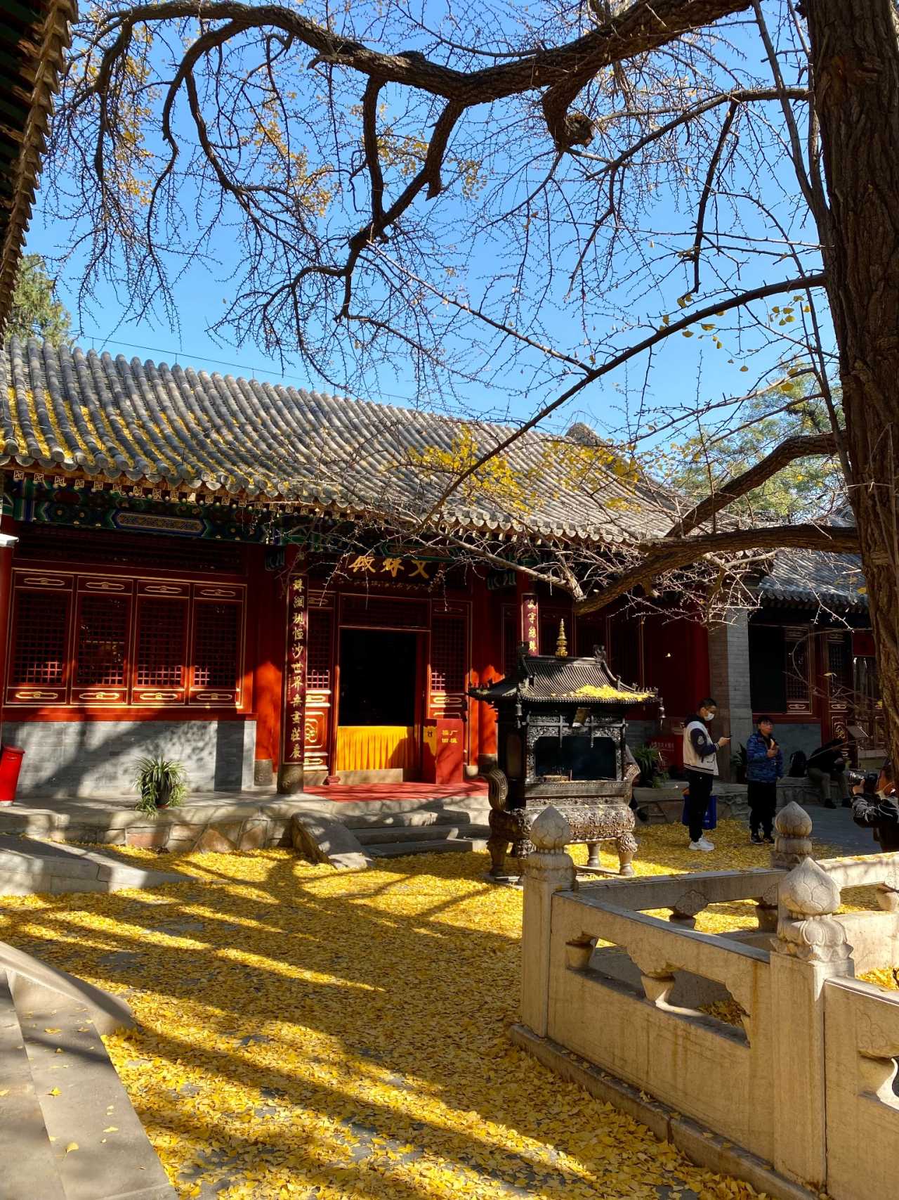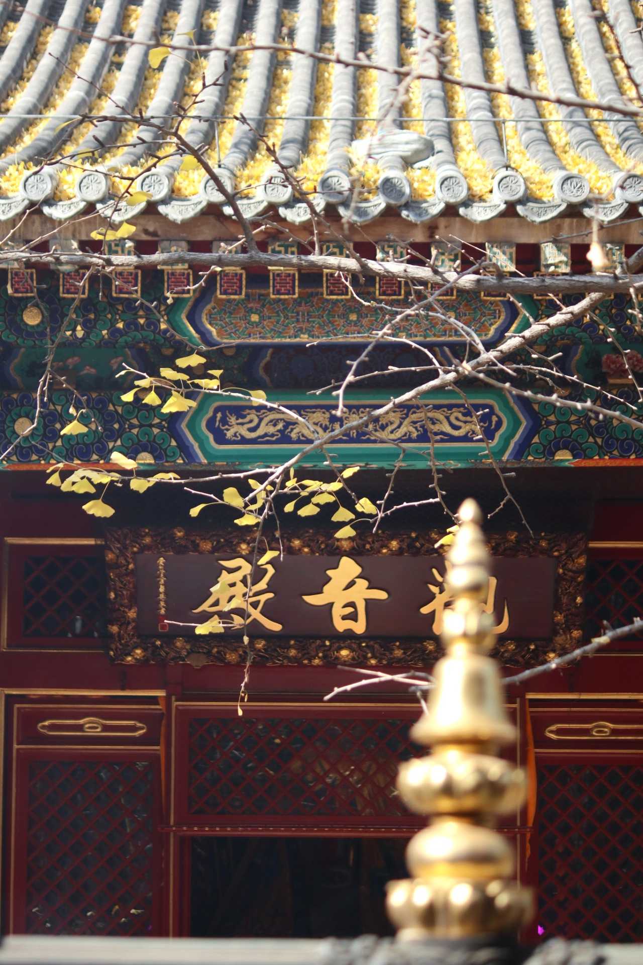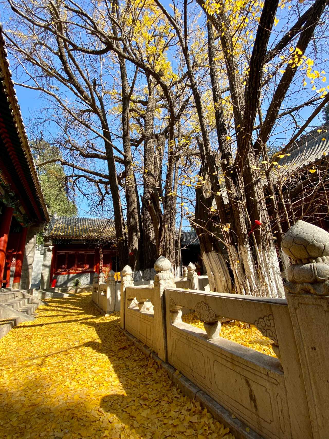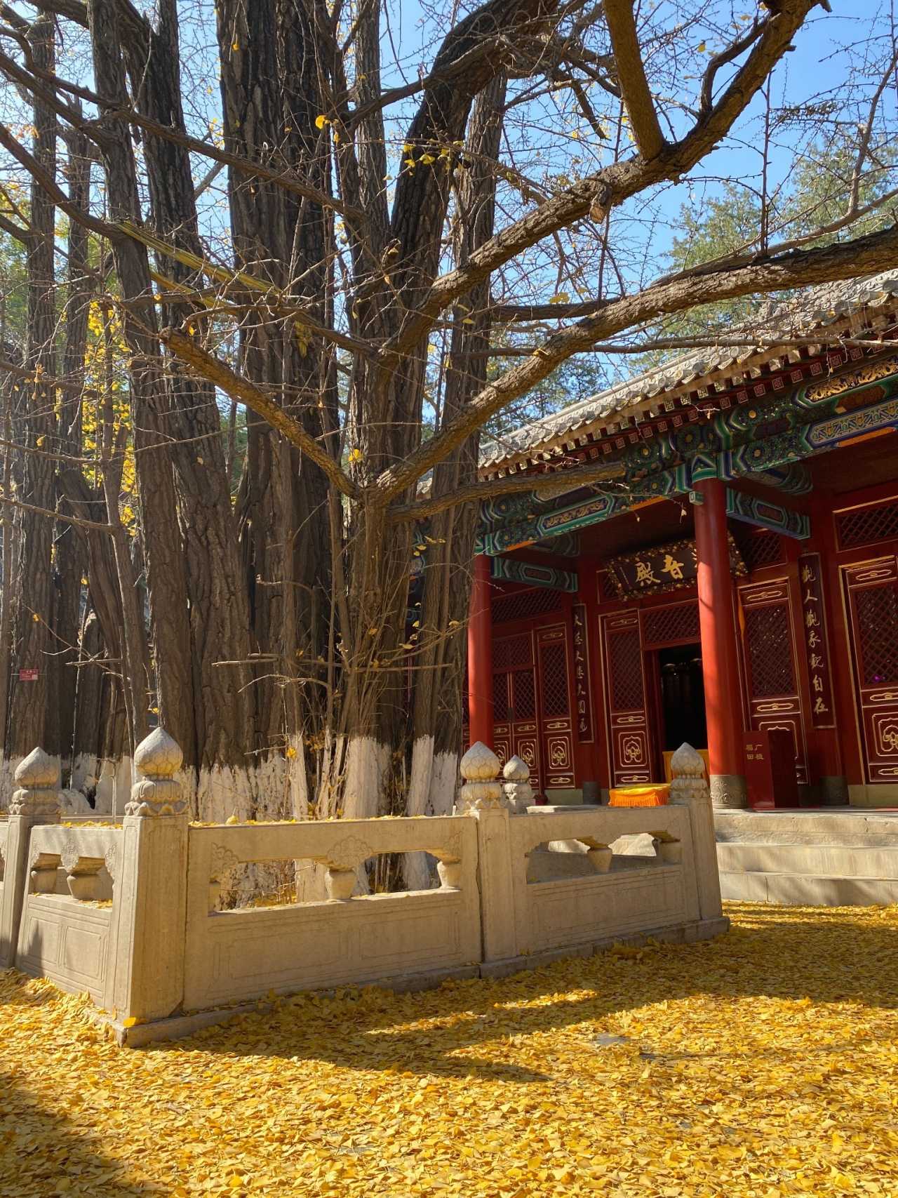 四处大悲寺:观音殿前有两株800余岁的古银杏树,因为大风叶子基本都掉了,但红墙黛瓦的古寺映衬着铺满地面的金黄色落叶,也十分好看