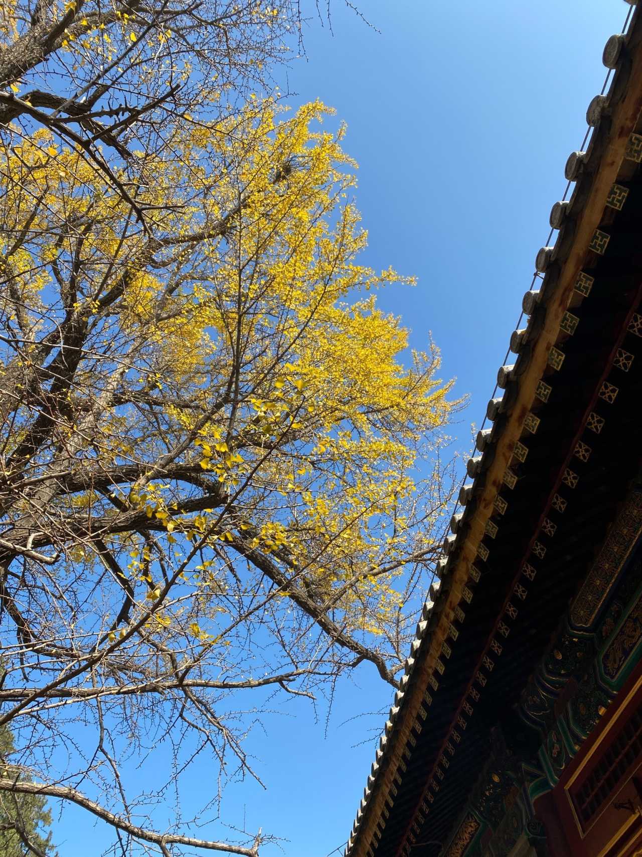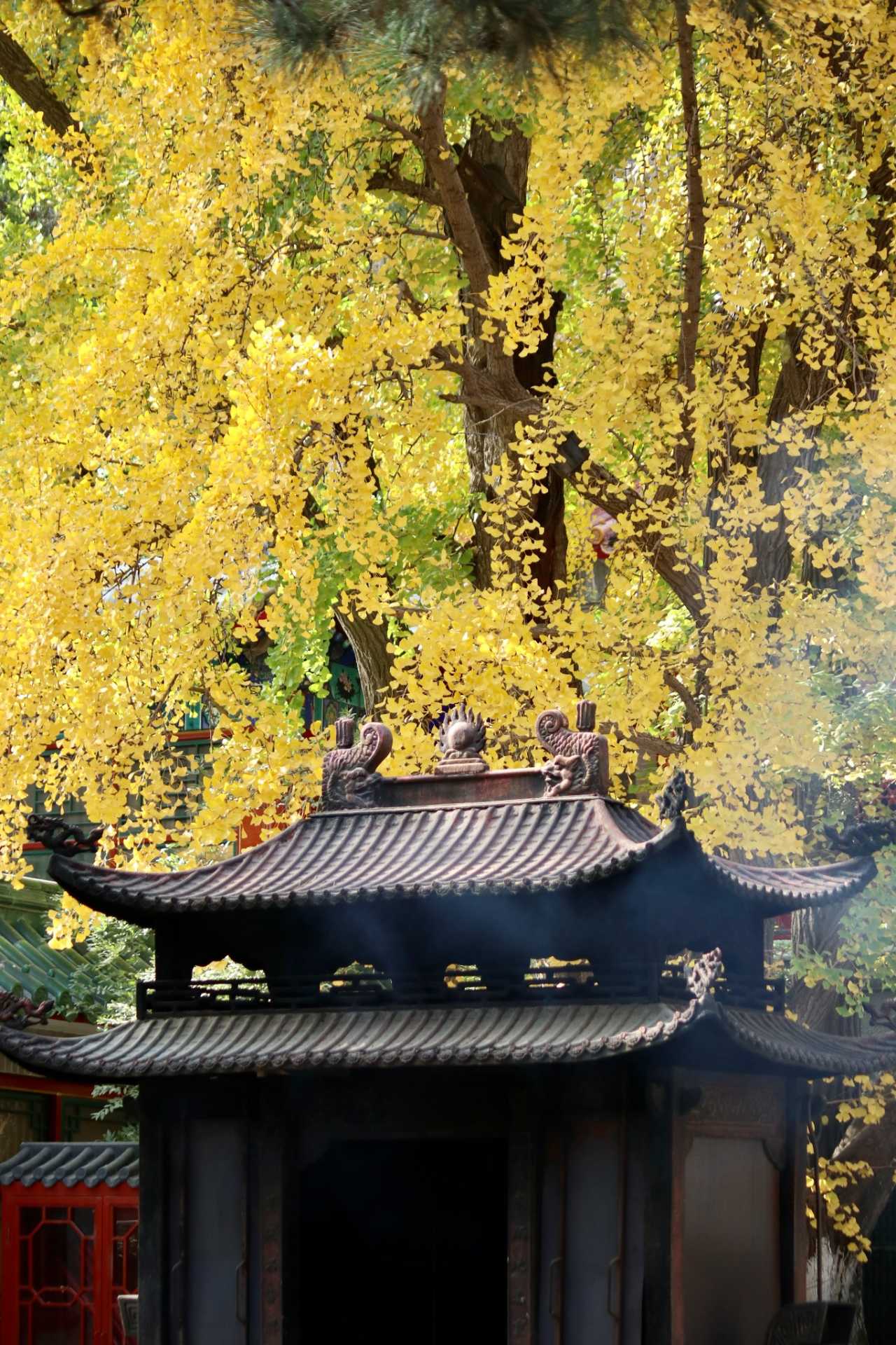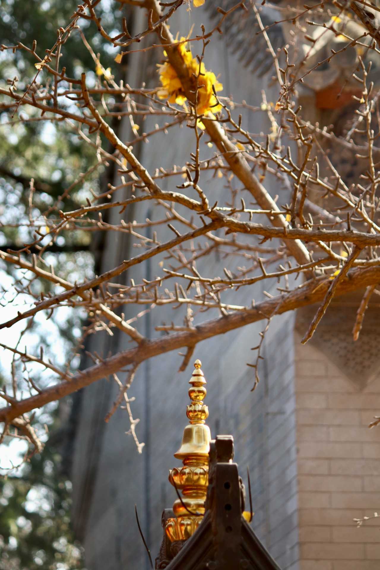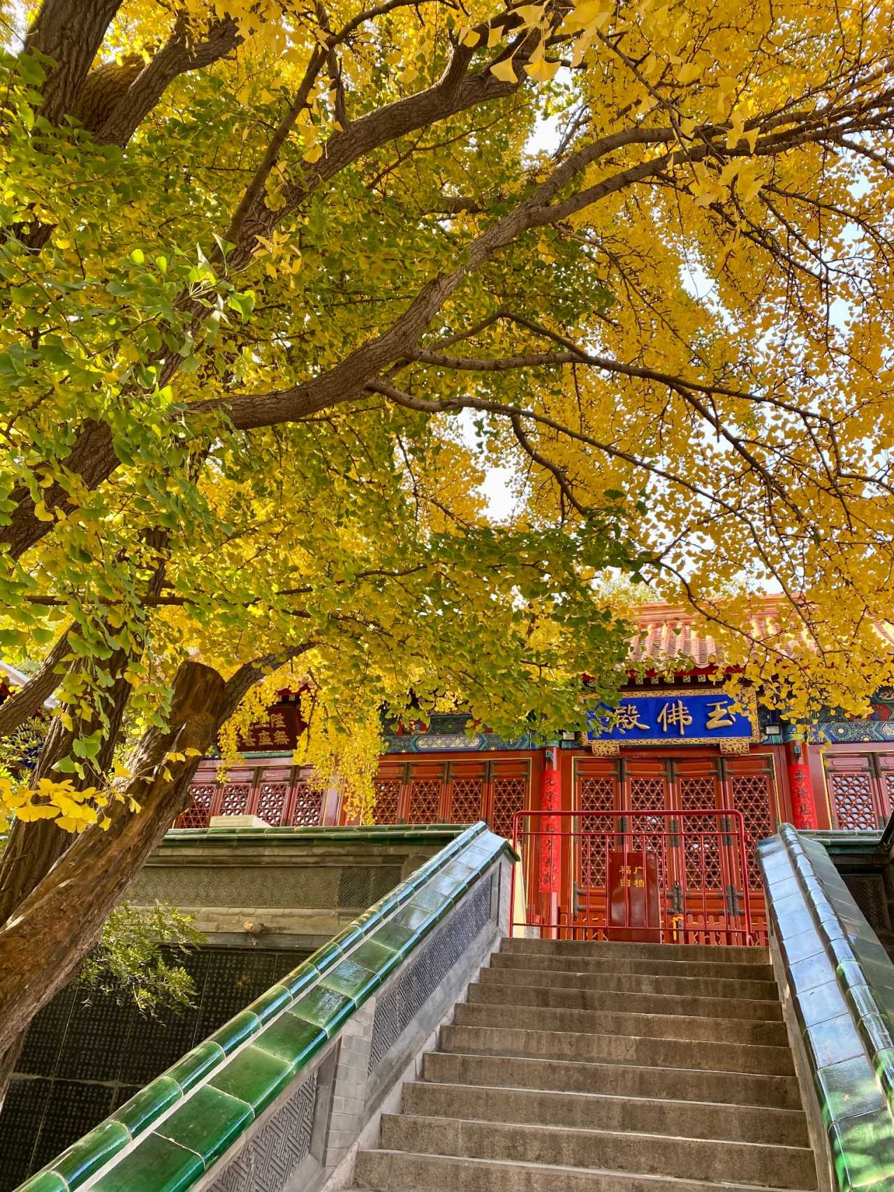 二处灵光寺:玉佛殿前有一株很高大的银杏树,目前黄了90%,周末去看正好