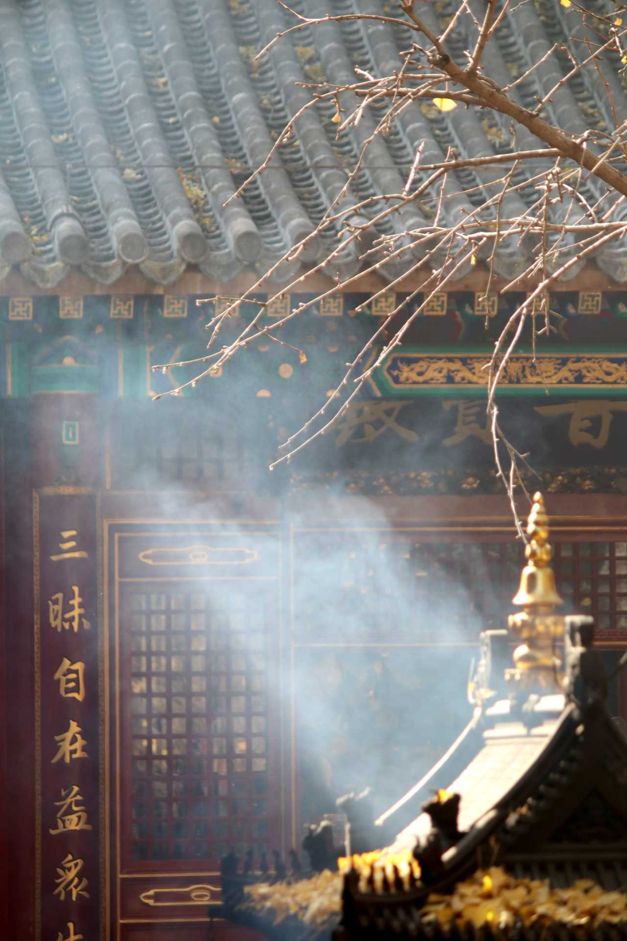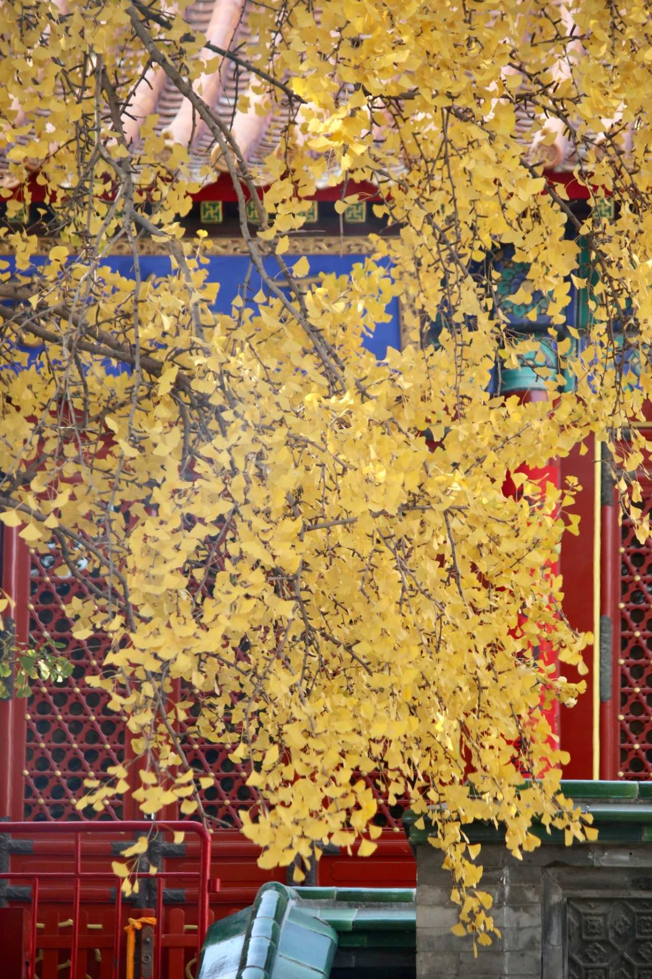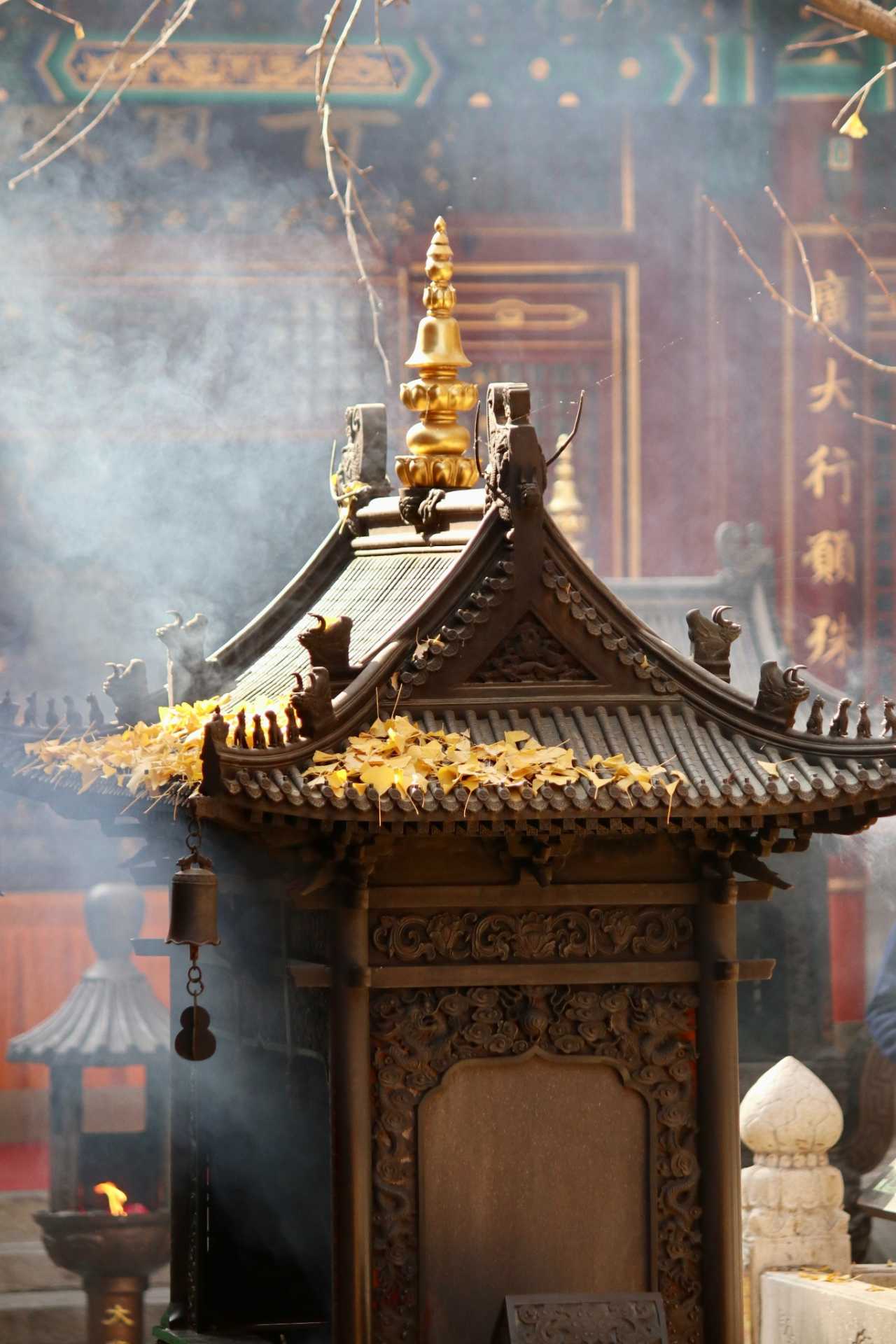 二处灵光寺:玉佛殿前有一株很高大的银杏树,目前黄了90%,周末去看正好