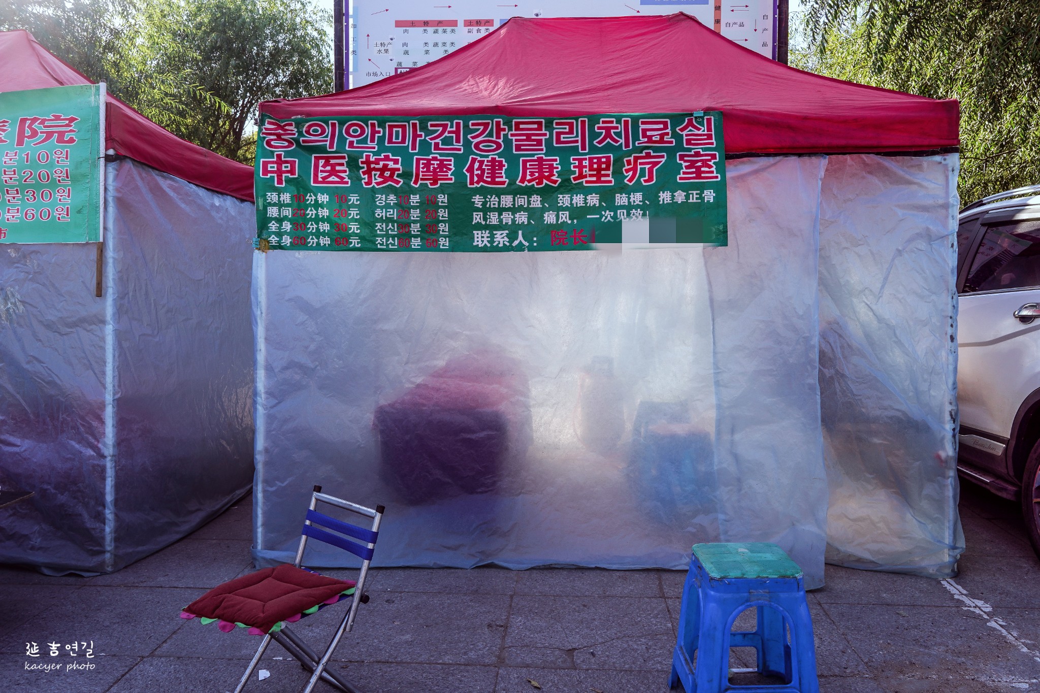 在入口处的空地上,会有一些简易的按摩室,价格非常便宜,按摩师们在门口散漫地闲聊,也不拉客。等了一小会儿,也没看见有人上前体验。挂着透明帘子的小房子看起来私密性也一般,感觉在这里按摩有点社死,但对于天生社牛的东北人来说,这都不算事儿吧~~~