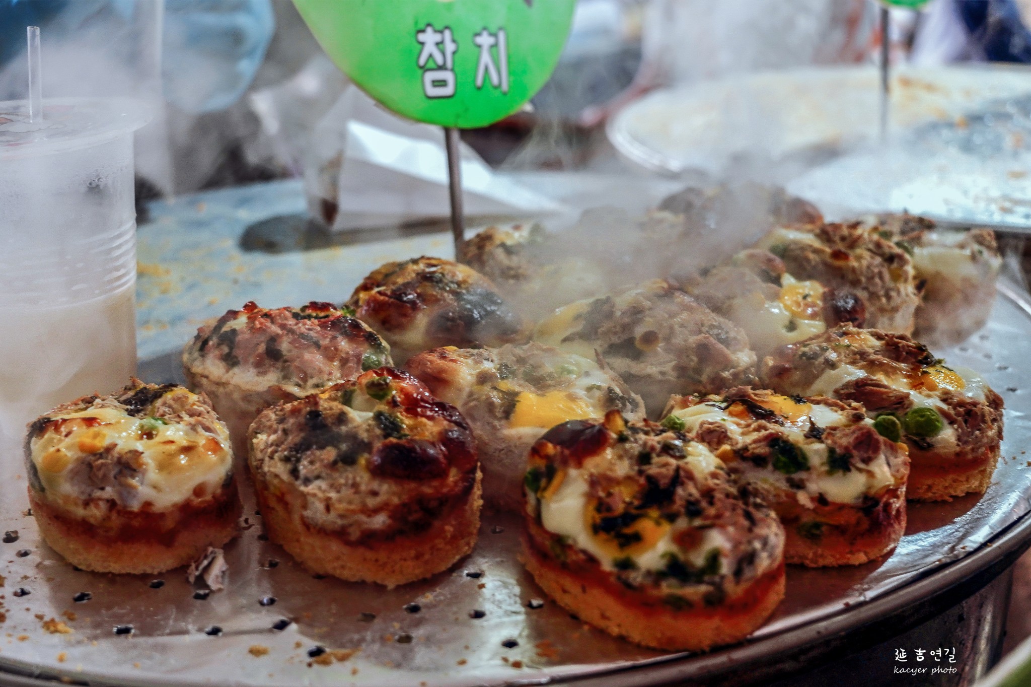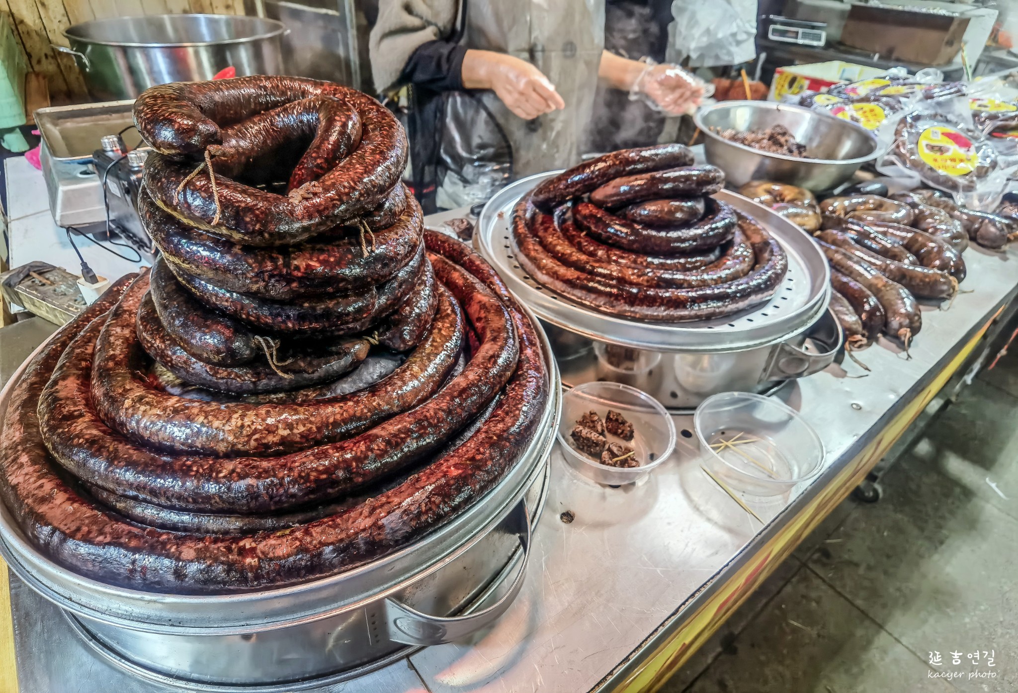 热情的摊贩向来往的行人发出试吃的邀请,泡菜、血肠、打糕应有尽有,不用去早餐店也能混个半饱……