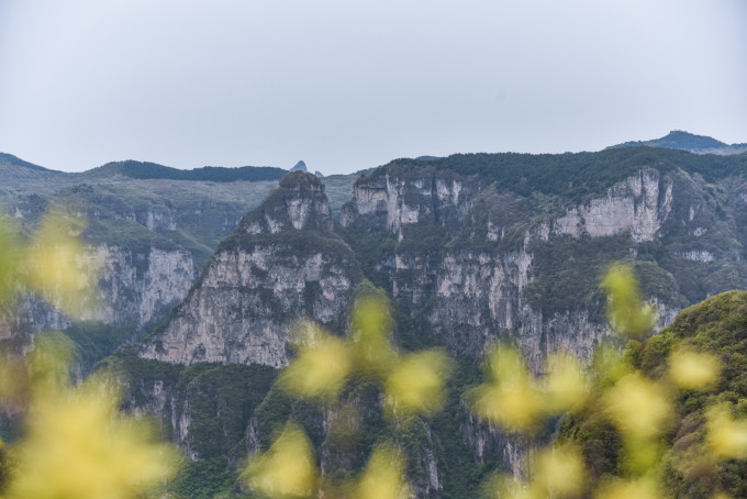 连翘映衬着太行山脉