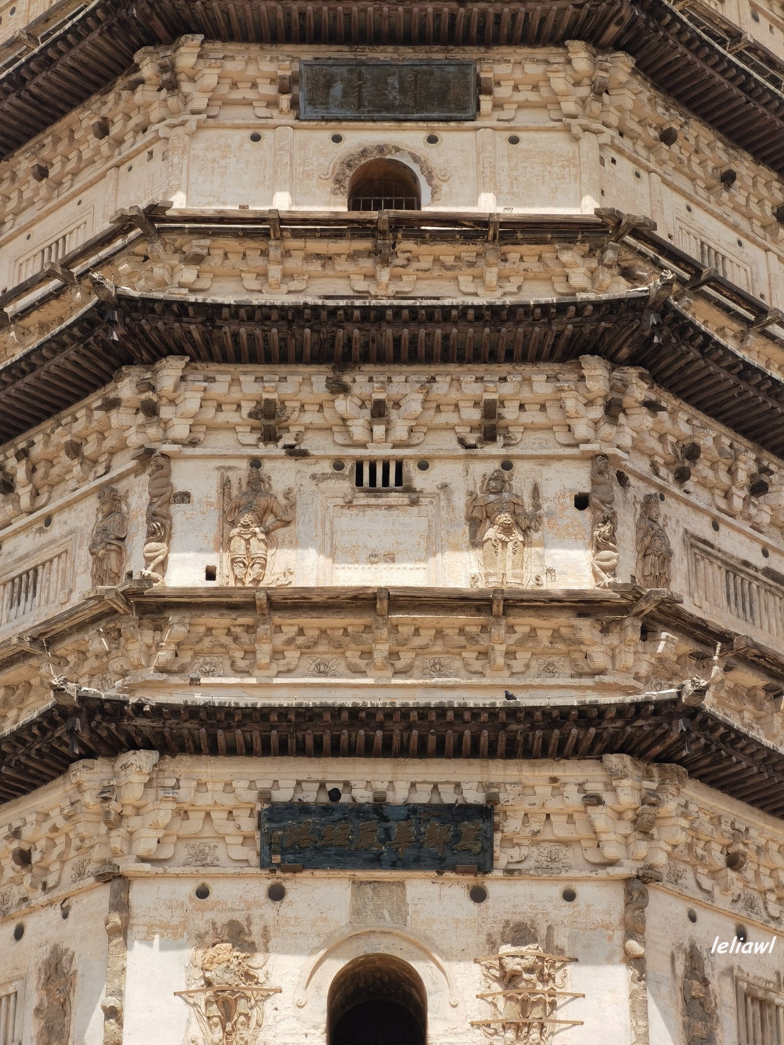 此塔为八角七层,砖木混合结构的楼阁式塔,由塔基、塔座、塔身、塔刹组成,高55.6米。内设有回廊阶梯,可以逐级登至塔顶;回廊内、外壁现存六块金代石碑。塔内有梵文、巴思八文、古叙利亚文、契丹文、女真文、突厥文等多种少数民族文字的墨书题记。塔体表面第一、二层塑有砖质半浮雕的佛教造像36尊,每个转角上刻有栩栩如生的蟠龙,是该塔最为重要的艺术品。