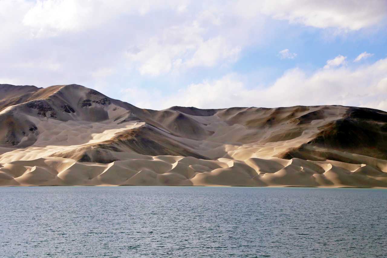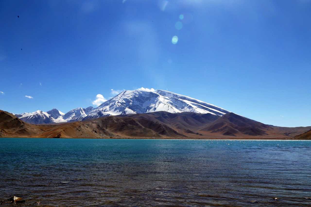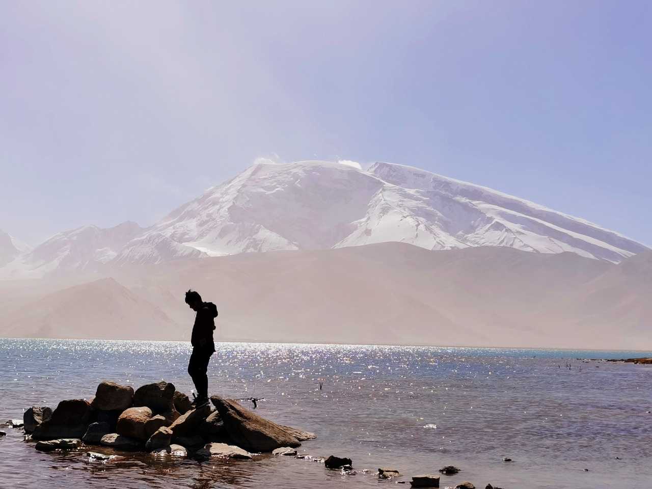 风沙漫天时,喀拉库勒湖和远处的慕士塔格峰又是另一番风景。