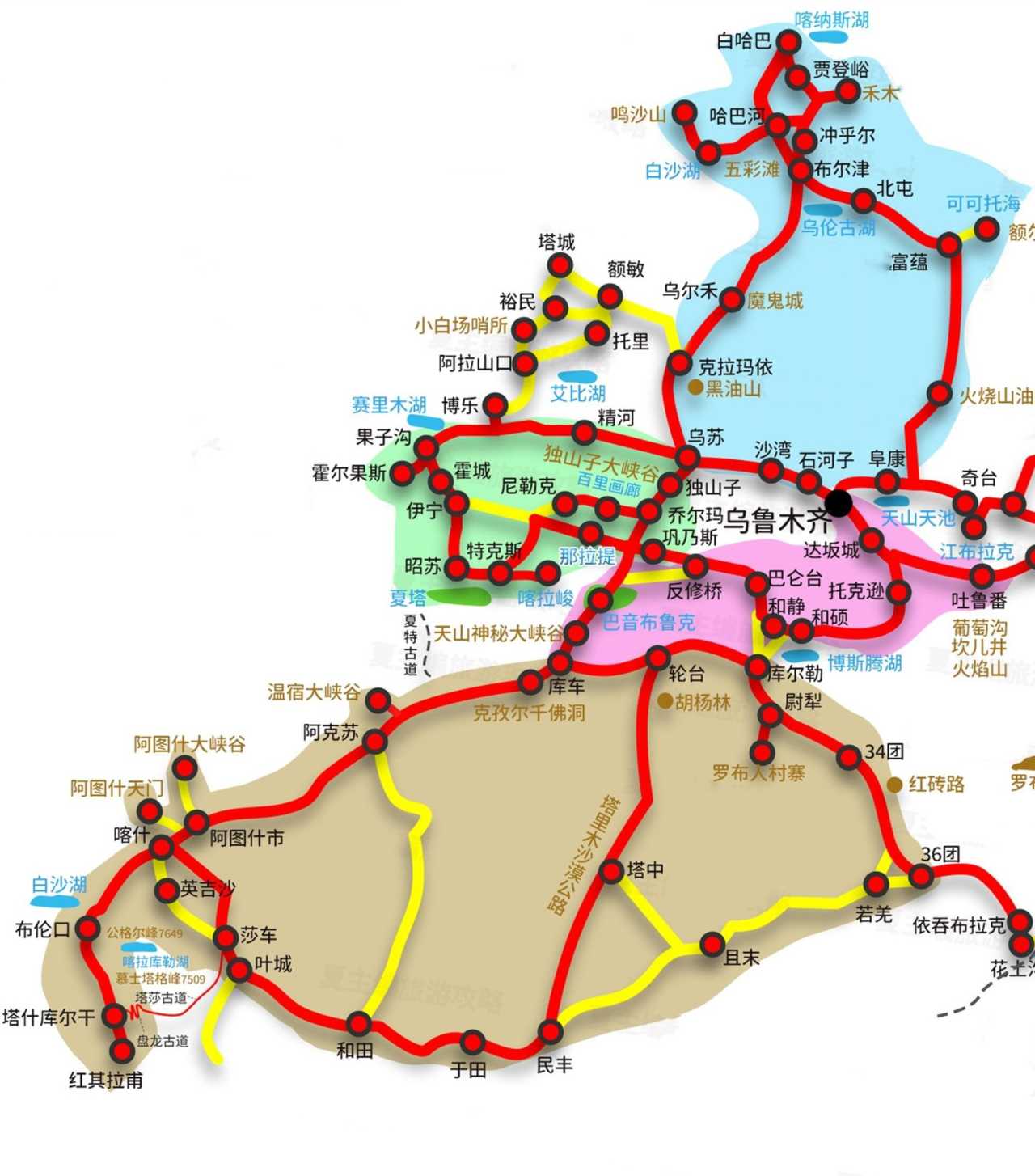 1、蓝色区域:北疆,主要景色有白桦林、湖泊、兵团风光等,代表景点:喀纳斯、禾木、可可托海、五彩滩;适合9-11月去看秋景。