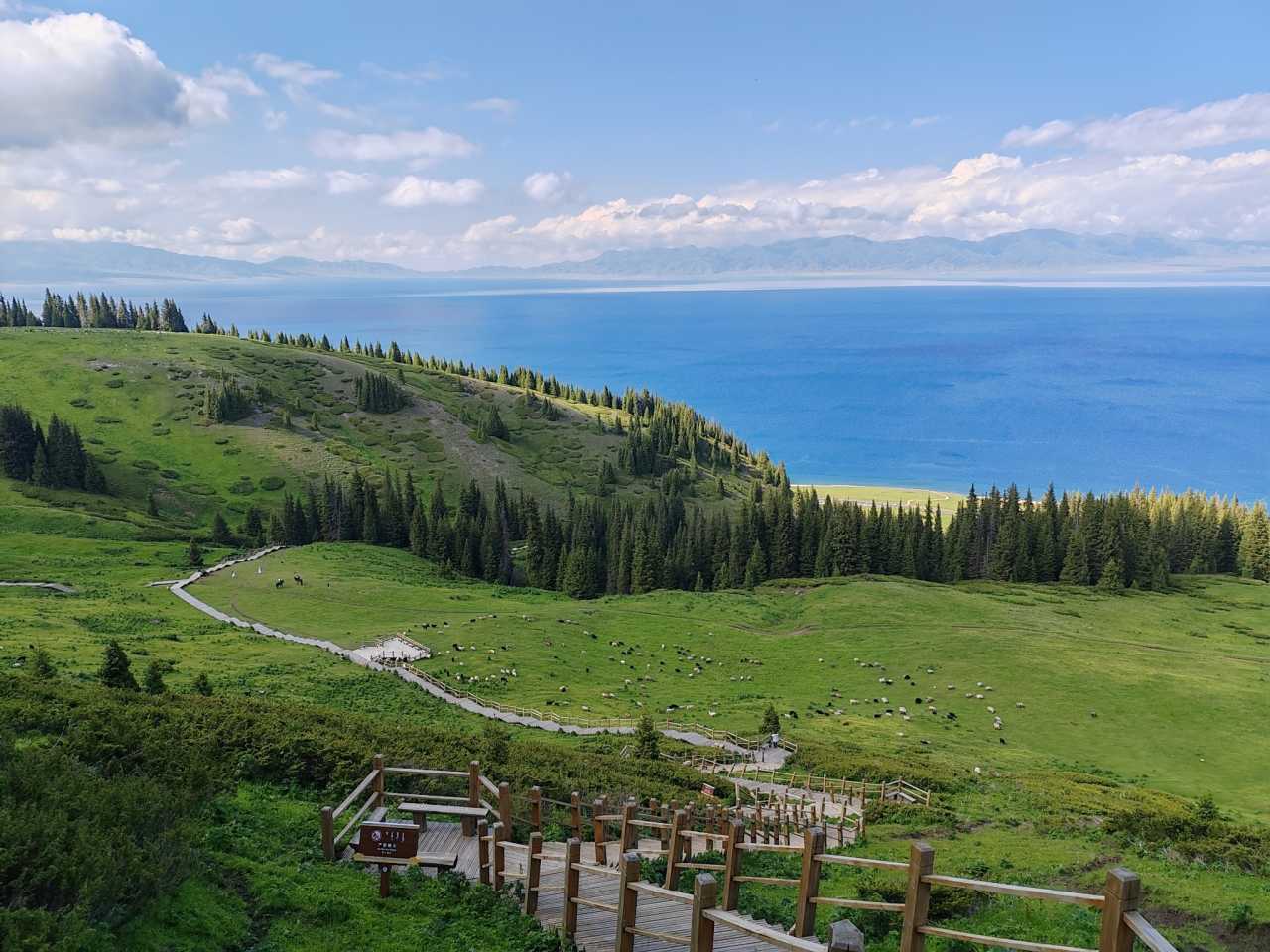 一定要沿着栈道爬到最高处,近处青草黄花、稍远是松林、湖和天连成一线、更远还能看到雪山……层层递进,尽铺眼前!