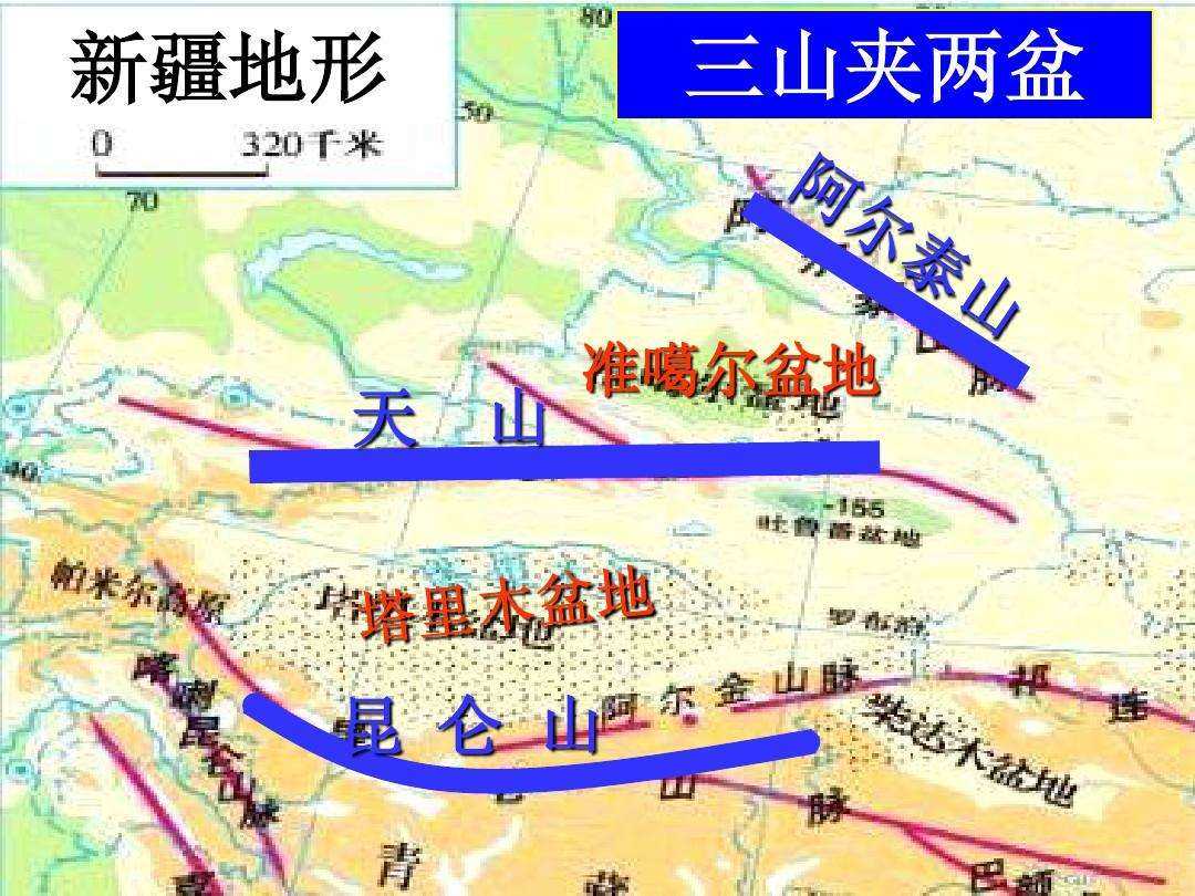新疆是我国最大的省级行政区,约占总国土面积的六分之一。总结新疆的地形特点,即“三山夹两盆”。三山指:最北的阿尔泰山、中部的天山、南部的昆仑山;两盆夹在其中的准噶尔盆地、塔里木盆地。