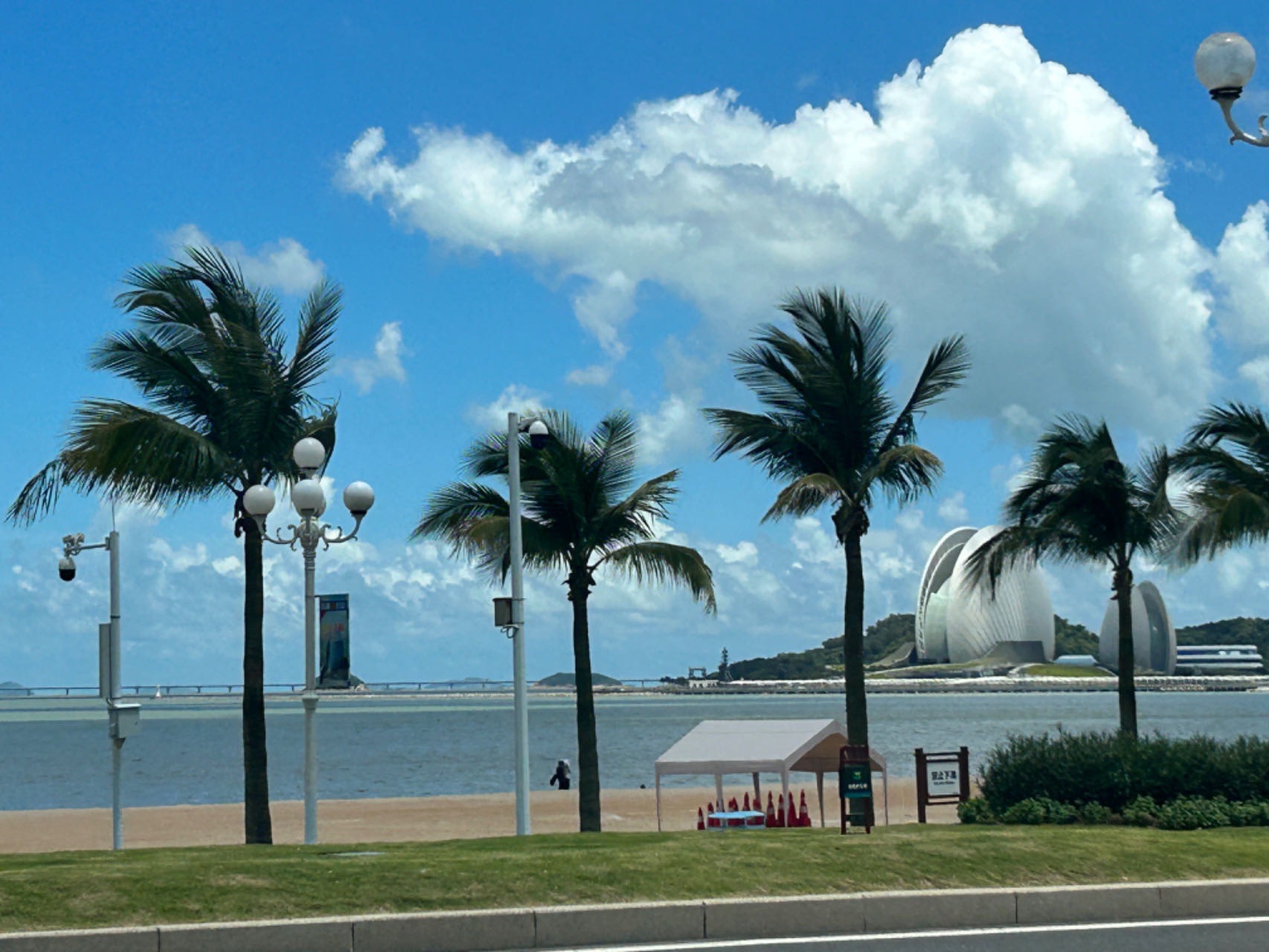 继续前进,没多久就进去情侣北路,引入眼帘的是道路两边的椰子树,左边是一望无尽的大海,衬托着蓝天白云,真的很美,第一次觉得珠海这么美丽。我特意放慢车速,让大家愉快欣赏。