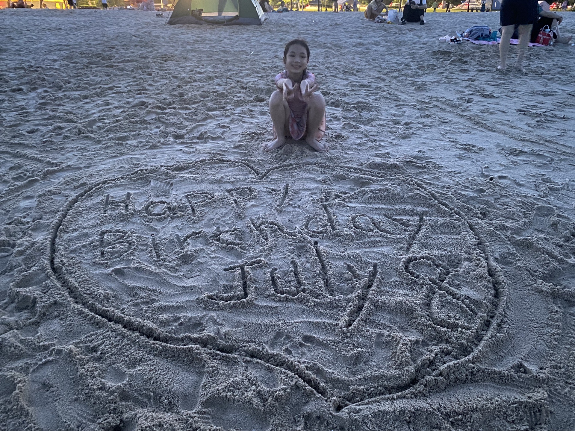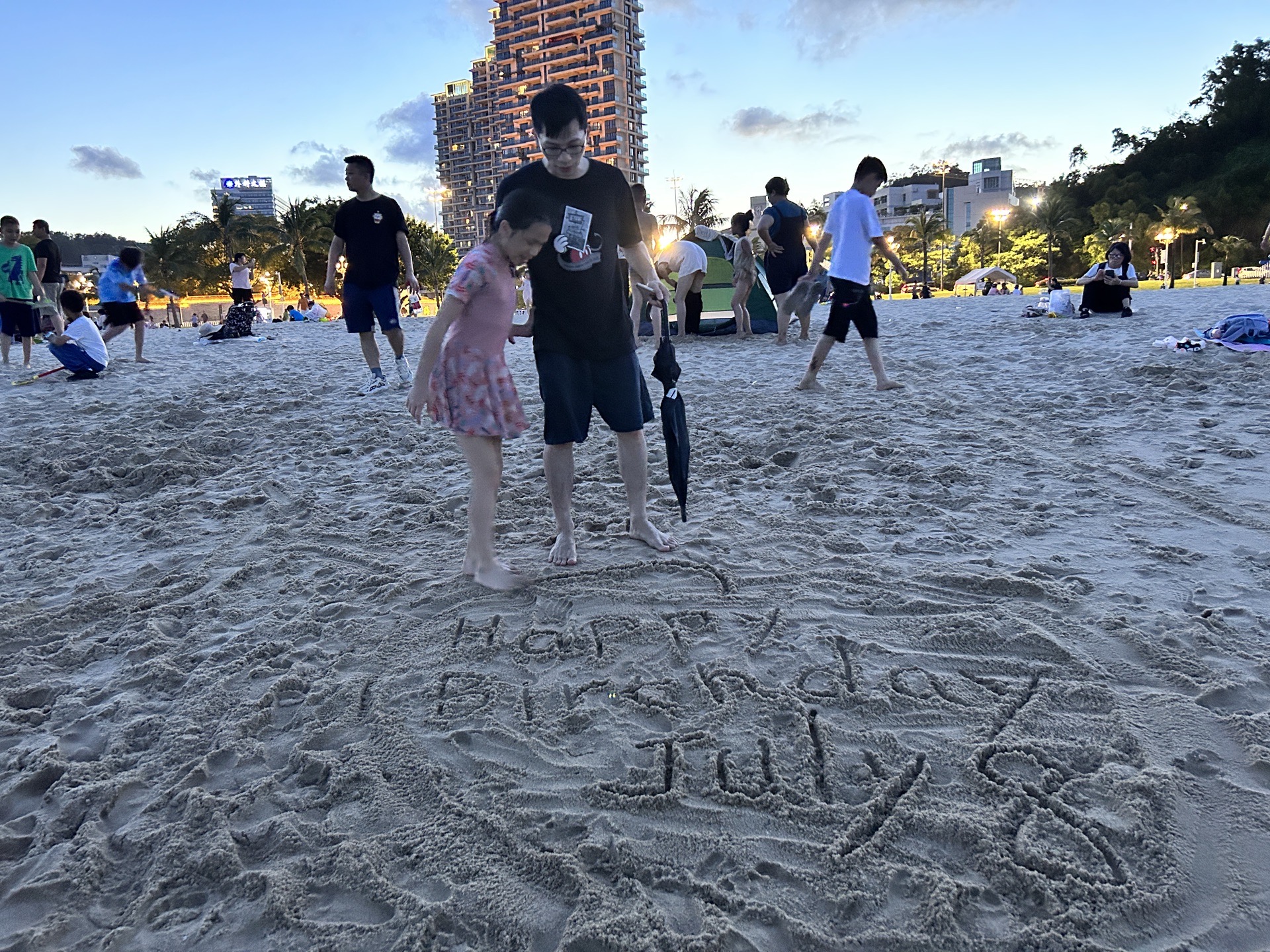 五点多六点,我们转移到海天公园沙滩,这边的沙比较细也很柔远,离日月贝更近,景色更加美丽,非常适合一家大小,只需要带上一张沙滩垫即可。孩子们继续玩水,可我已经累了,直接躺在沙滩垫上,把帽子往脸上一盖,闭上眼睛,感受着凉爽的海风从海上吹来,吹拂着劳累的身体,海风和皮肤摩擦着,带走身上的汗液,这感觉只有身临其境才能感受到。当我醒来时,已经是晚上7点了,可是天空还是很明亮,丝毫没有一丝疲倦。我起来往海边一看,已经退潮了,露出了淤泥(怪不得海水这么浑浊,哈哈),淤泥之上还有一大片湿漉漉的粗沙子,大家都在挖沙洞,玩得不亦说乎。我趁着还天亮,赶紧到湿沙子上,拿起雨伞,写下:Happy Birthday,女儿补上日期:July 8。没错,今天是我女儿生日,希望她永远记住爸爸对她的爱。