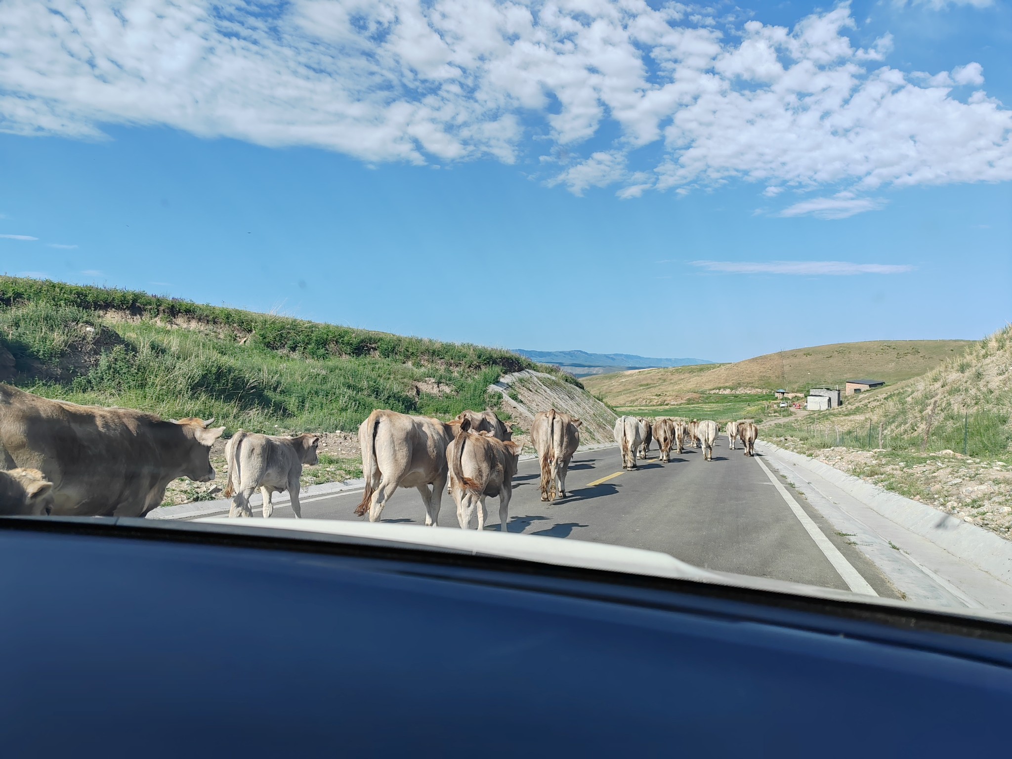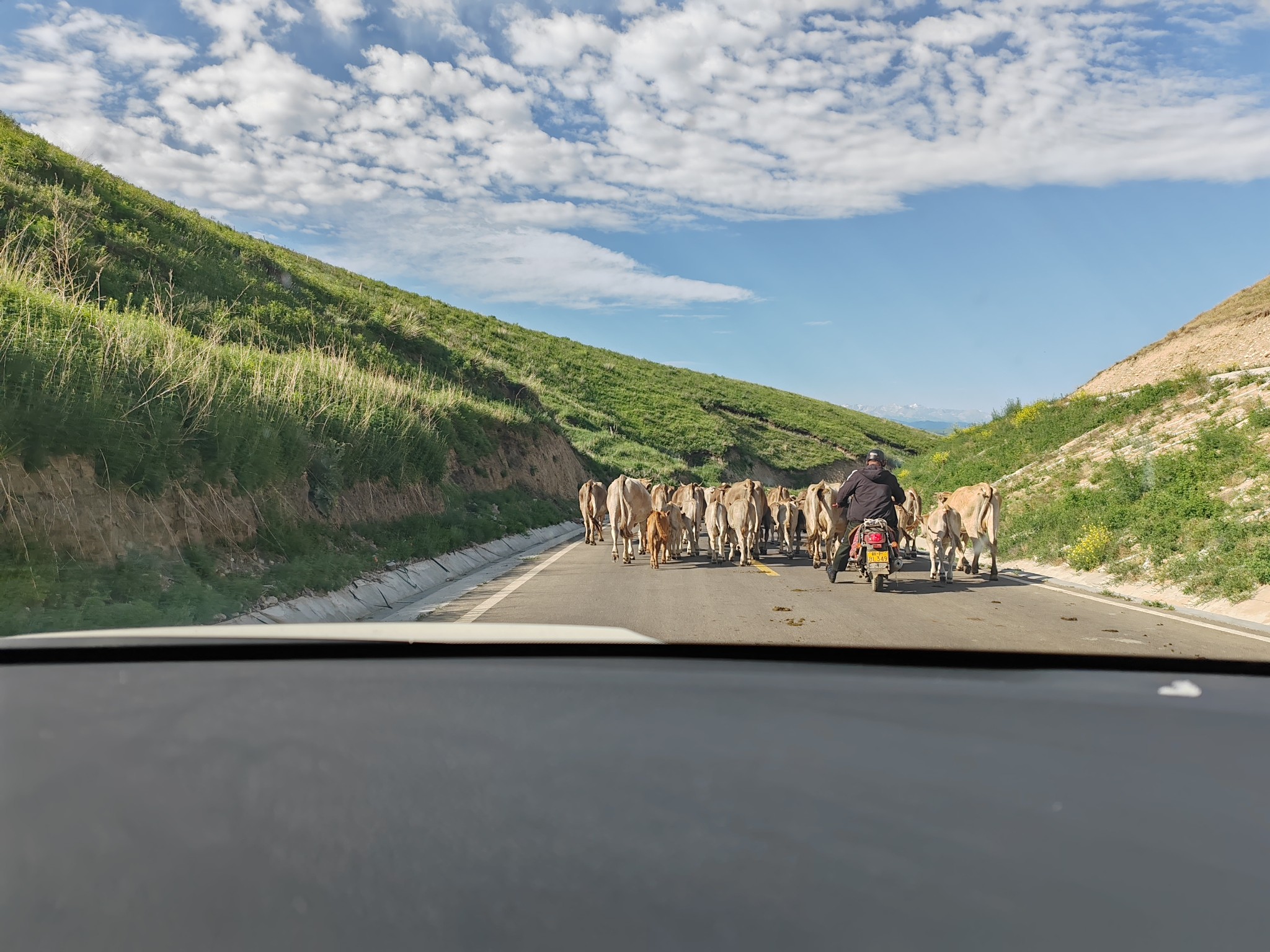 我一马当先,逼近牛群。把它们赶到了一边,硬是开出来一条路,后面的车也跟着我顺利通过。