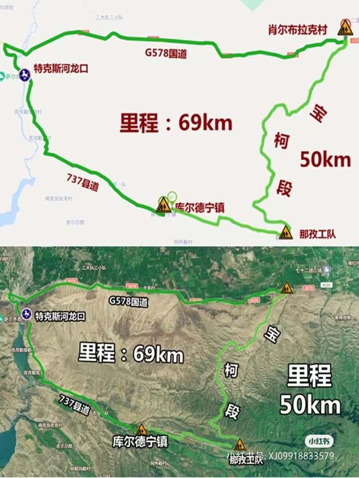 一般驾车导航从新源到库尔德宁景区,会让你走(G578国道+737县道,69公里),按照行前的攻略,用高德导航可以选择走(宝柯段+Z784线,50公里)。