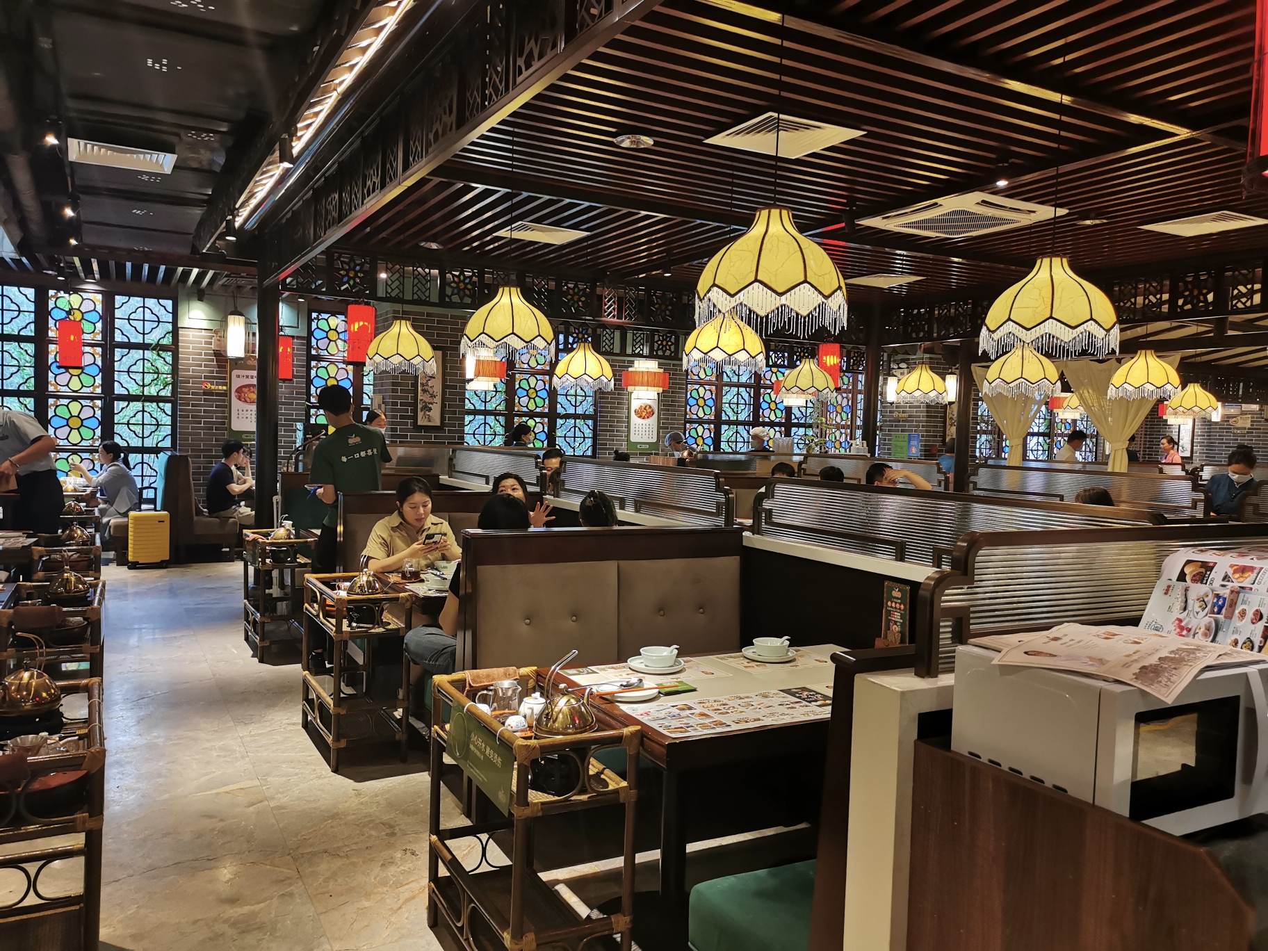下午五点半准时赶到悦满楼,整个茶楼环境不错,红木内饰及广式花窗搭配流苏吊灯,就餐环境显得古色古香。烫碗涮碟之后点餐,香脆明虾红米肠口感的确香脆,XO酱蒸凤爪肉粑骨烂,手打牛肉球要比豉汁蒸排骨好许多,最好吃的是新品三彩榴莲冰团和特价双皮奶,入口清爽且嫩滑,味蕾再一次被广东早茶俘获,尤其是普洱相佐,真的是叹茶过浮生。