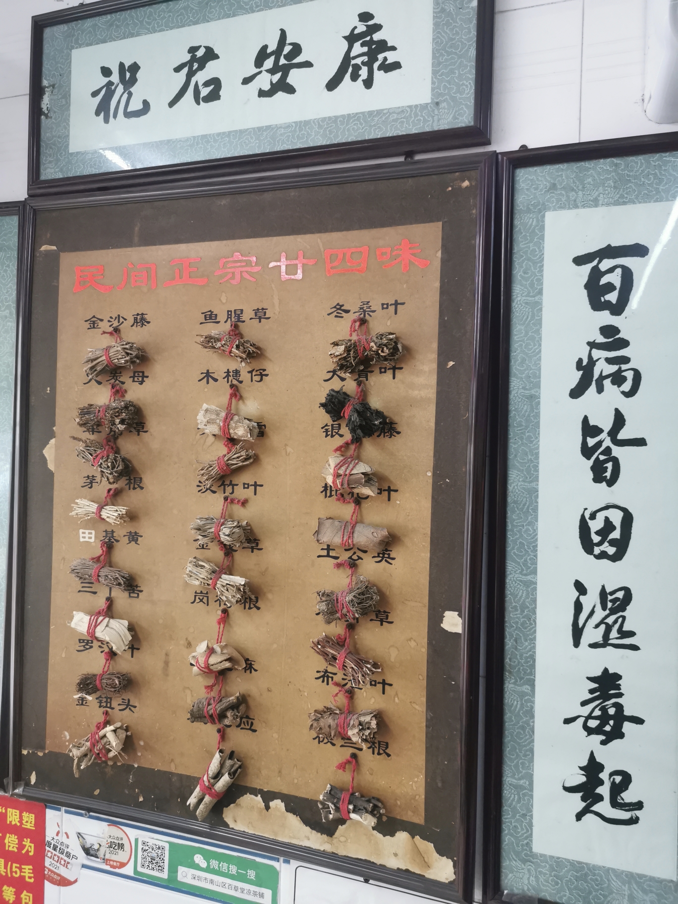 冒雨从海上世界的明华轮走到蛇口新街,期盼的揭阳老五粿条汤尚未营业,饥肠辘辘只能吃相隔不远的德记隆江猪脚饭,猪脚卤的耙烂味道还行,肉卷倒是一般。惊喜的是隔壁的百草堂祖传凉茶铺,店铺墙壁上挂满了玻璃画框,装裱有对联、草堂凉茶简介等,最稀罕的是凉茶廿四味,每味药的小样用红线绳绑扎好,挂在相应药名下方的螺丝钉上,从细节看得出店主是个细心懂药之人。手机扫码下单的杨枝甘露和红豆香芋椰汁选料讲究、口感软糯,是这趟出行吃到的最好的杨枝甘露,有时候真的是失之东隅,收之桑榆。