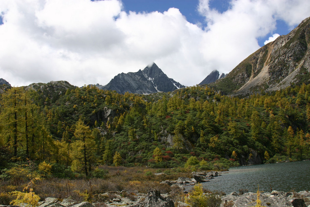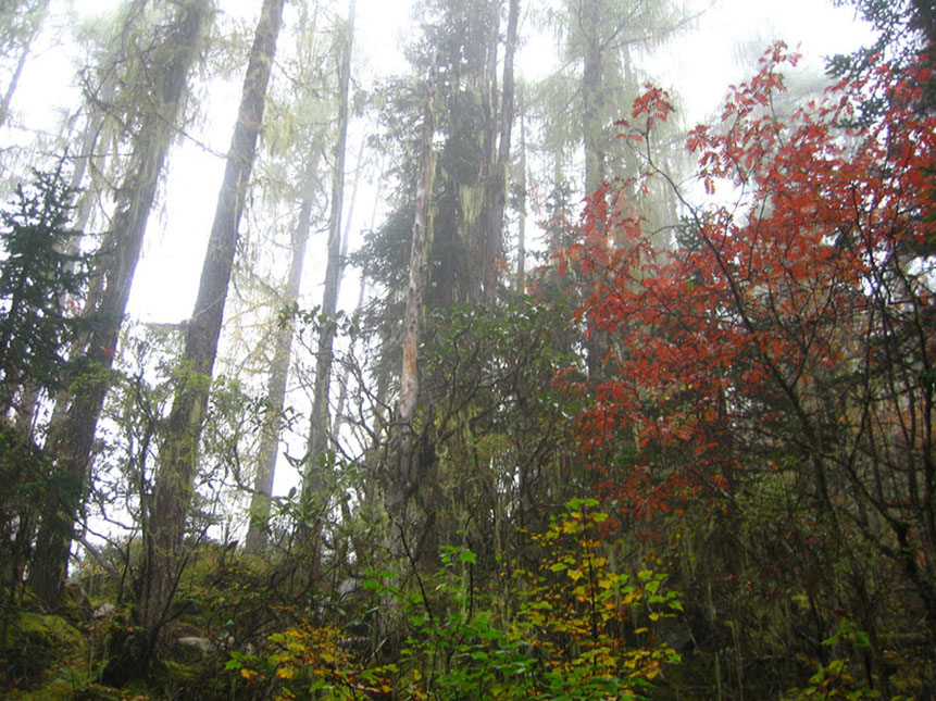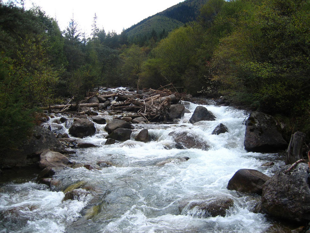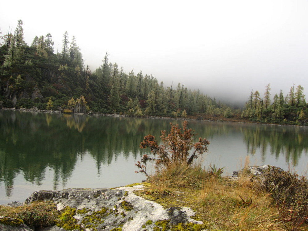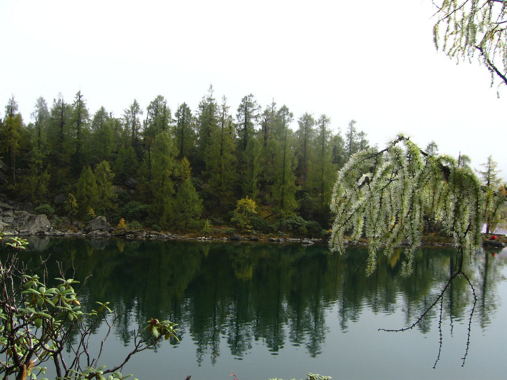 雪山、白云、蓝天、红绿色的草甸倒映在宛若五色宝镜般的湖面。这种美是一种慑人魂魄的诱惑,难言的美。葫芦海静静地躺在蓝天白云之下,碧草森林之间,水色由浅至深,由淡蓝向深绿延伸。微风中,水面波光点点,落叶荡荡悠悠。她如同天堂之水,吸取了日月精华、天地灵气;她是那么洁净,仿佛少女稚嫩的面庞,璞玉无暇;她是那么清澈,仿佛初涉世事的孩童,透明如玉;一个半岛拐弯插入水中,岛上密密匝匝覆盖着高山杜鹃,花已谢,叶子变成了深绿色。山坡上已是秋意盎然,如大师笔下的色彩泼墨,星星点点在林间散落。远处黛色的山体庄重而冷峻,山脊上白雪皑皑,如高傲公主头上耀眼的光环。党龄的海子和普通的海子相比,更多了一种柔美。她把九寨沟水的妩媚、斑斓,和雪山的坚毅、冷峻融合在了一起。葫芦海,千百年来就这么孤独着,仿佛养在深闺清丽脱俗的处子,深藏在崇山峻岭之中,依任时光如水般地流失。面对她真的没有更确切的词来形容和赞美她的美,只有你亲眼看见,置身其中,才能真正的体会到。
