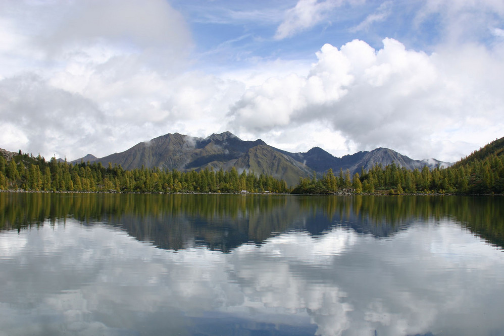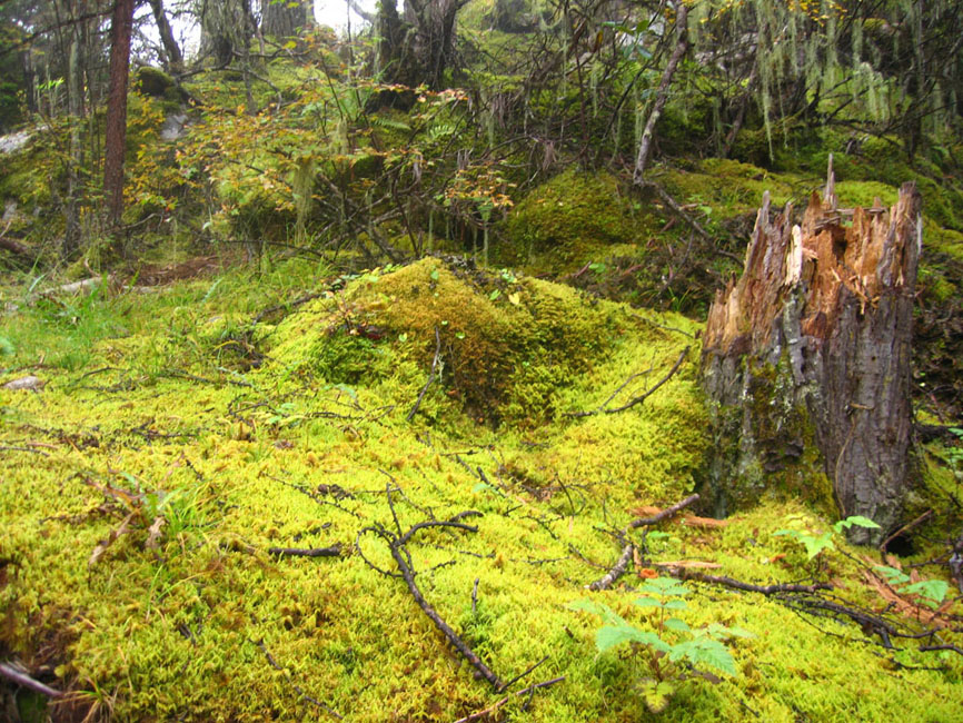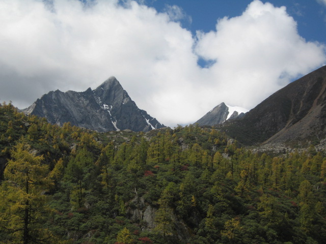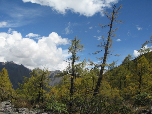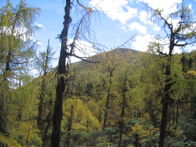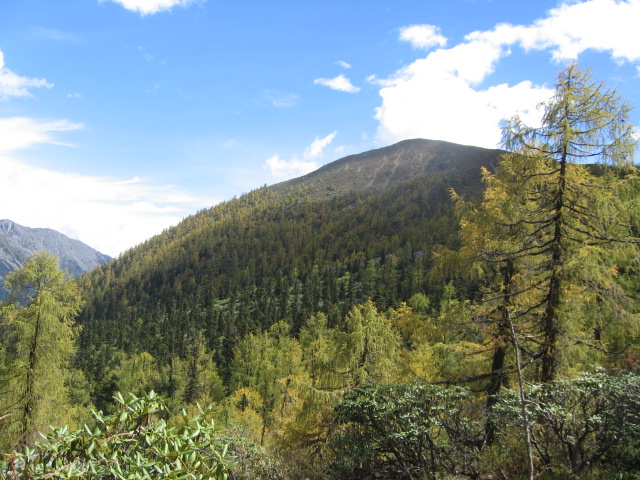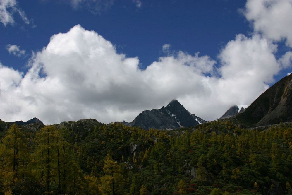 雪山、白云、蓝天、红绿色的草甸倒映在宛若五色宝镜般的湖面。这种美是一种慑人魂魄的诱惑,难言的美。葫芦海静静地躺在蓝天白云之下,碧草森林之间,水色由浅至深,由淡蓝向深绿延伸。微风中,水面波光点点,落叶荡荡悠悠。她如同天堂之水,吸取了日月精华、天地灵气;她是那么洁净,仿佛少女稚嫩的面庞,璞玉无暇;她是那么清澈,仿佛初涉世事的孩童,透明如玉;一个半岛拐弯插入水中,岛上密密匝匝覆盖着高山杜鹃,花已谢,叶子变成了深绿色。山坡上已是秋意盎然,如大师笔下的色彩泼墨,星星点点在林间散落。远处黛色的山体庄重而冷峻,山脊上白雪皑皑,如高傲公主头上耀眼的光环。党龄的海子和普通的海子相比,更多了一种柔美。她把九寨沟水的妩媚、斑斓,和雪山的坚毅、冷峻融合在了一起。葫芦海,千百年来就这么孤独着,仿佛养在深闺清丽脱俗的处子,深藏在崇山峻岭之中,依任时光如水般地流失。面对她真的没有更确切的词来形容和赞美她的美,只有你亲眼看见,置身其中,才能真正的体会到。