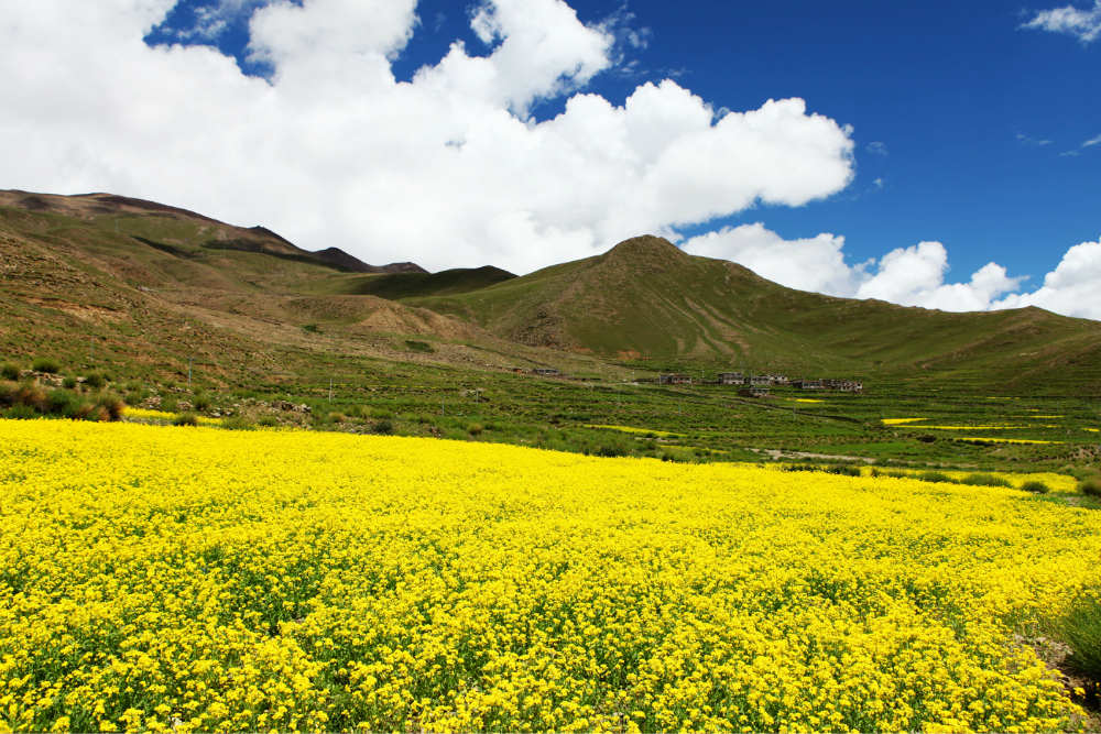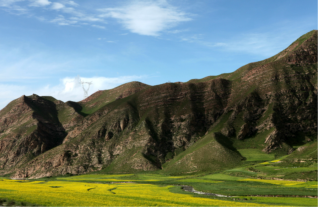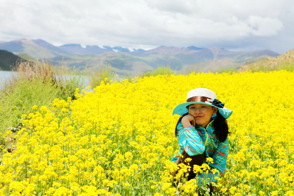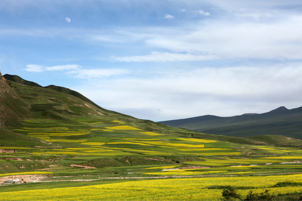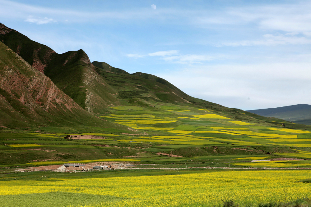 临近青海湖 ,正值油菜花盛开。放眼望去一片片的油菜花和巍峨的山脉,蔚蓝的天空相互映衬,极为壮观,和安徽 的油菜花比起来倒是另外一番景象。
