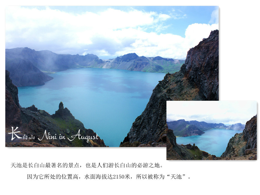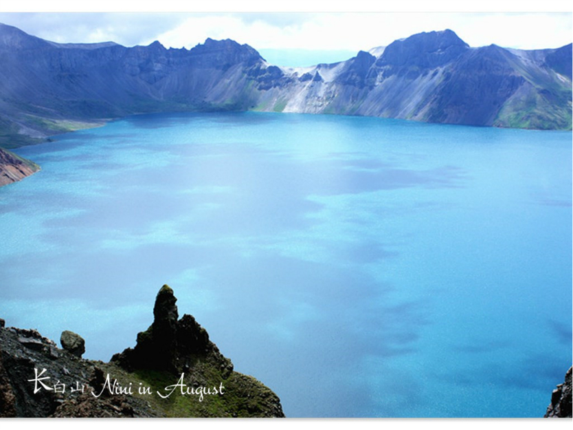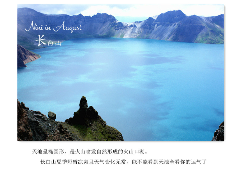 从二道白河镇到北山门大概30公里,需要30分钟以上,买票进山门排队等倒站车行经16公里的山路,车程12分钟。然后换乘越小车到山顶。这段盘山公路绝对惊险刺激,很多180度大弯,转弯的时候人在车内倒来倒去,还好我边上的同事不是胖子,否则非压扁不可。山顶海拔高度是2691米,到了后雾气很重,以为看不到了。谁知道走一小段台阶后到天池边上一望,哇!天池今天没带面纱,碧蓝蓝的湖水幽幽地泛着银光,真的很美呢。