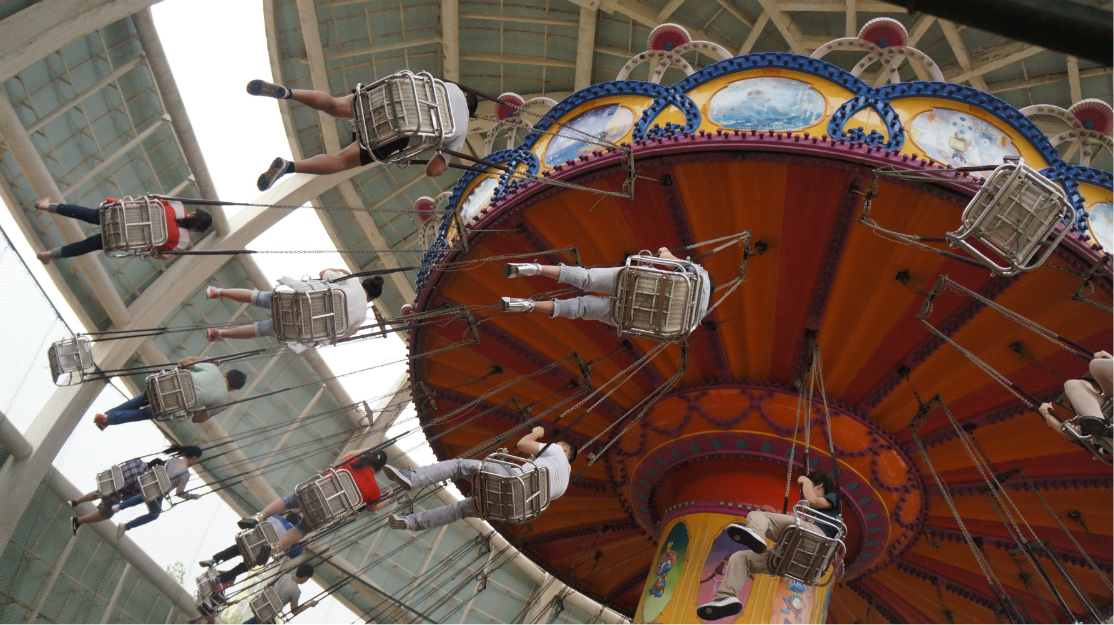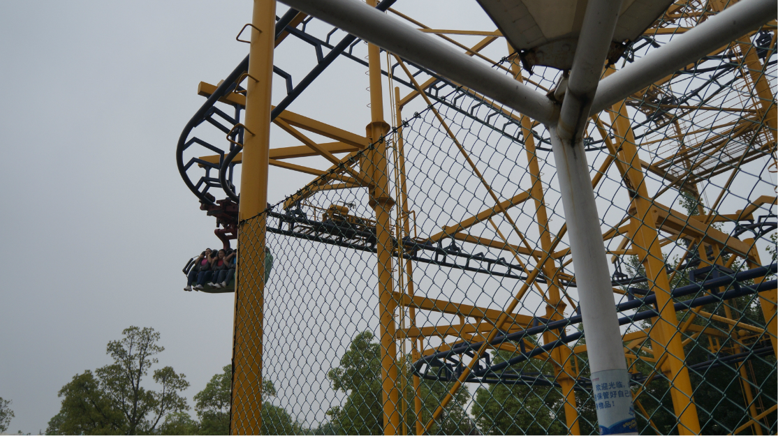 空中飞椅?? 脚不沾地叫人慎得慌啊 可是咱八哥说了 咱付了钱进来的 能玩多几个项目就得玩啊 你说说着逻辑————————————我听着也拍大腿叫对啊!!真是对!!所以我们就这么大无畏的上了!!离心力真可怕 就怕设施不牢靠 不会飞出去吧 其实玩的时候真是没多大感觉了 就是闭着眼 横着心豁出去!!真爷们!!不能怕!! 像我这种为了照片开着眼的恐怕真的不多啊 真心英勇
