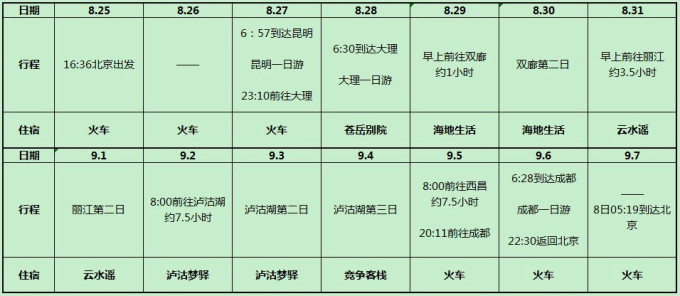 北京——昆明——大理——双廊——丽江——泸沽湖——成都——北京