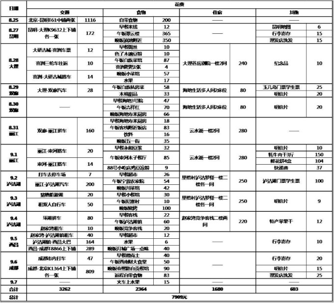 贴出来,可供参考。花费表是两个人算在一起的,不包含前期准备的东西,只是旅行中的花费,涵盖了从大到小所有明细,只有一些公交车费没有计算。由于是火车出行,全程客栈,我俩对吃又不是很在意,加上没买什么东西,所以花费还是很省的。