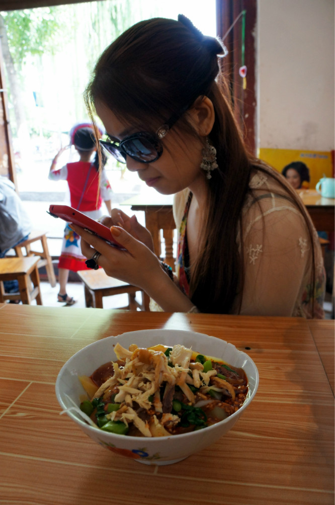 吃午饭的,谁知那里居然没开门,不知道什么原因。于是随便找了一家白族饭馆,点了木瓜鸡、杂锅菜和西兰花。木瓜太酸,杂锅菜也清汤清水,西兰花更是不如自己做的好吃。也许是我俩都不爱好美食,也都对云南风味不大习惯吧,这一路上对于美食的经验实在少得可怜。
