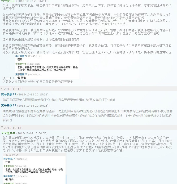 当时当我接到电话的那瞬间,我以为师傅只是和我确认晚上的接机时间而已。我这个人做事情比较死心眼,我喜欢把所有事情一次又一次的确认,我才放心,谁知道我在确认行程的时候,司机师傅不承认他们有过修改行程的行为,坚决要按照第一次的行程走,并且10月2日在游玩黄龙 后只把我们送到川主寺!这时候我面临了很多问题!