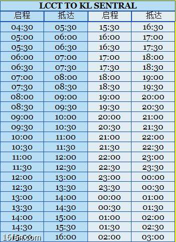 黄巴:发车频率半小时一班,从LCCT逢整点和30分发车,最早一班4:30am,最晚一班2:00am;从KL sentral逢15分和45分发车,最早一班3:15am,最晚一班22:30pm。可以在LCCT机场内的售票点拿时刻表。
