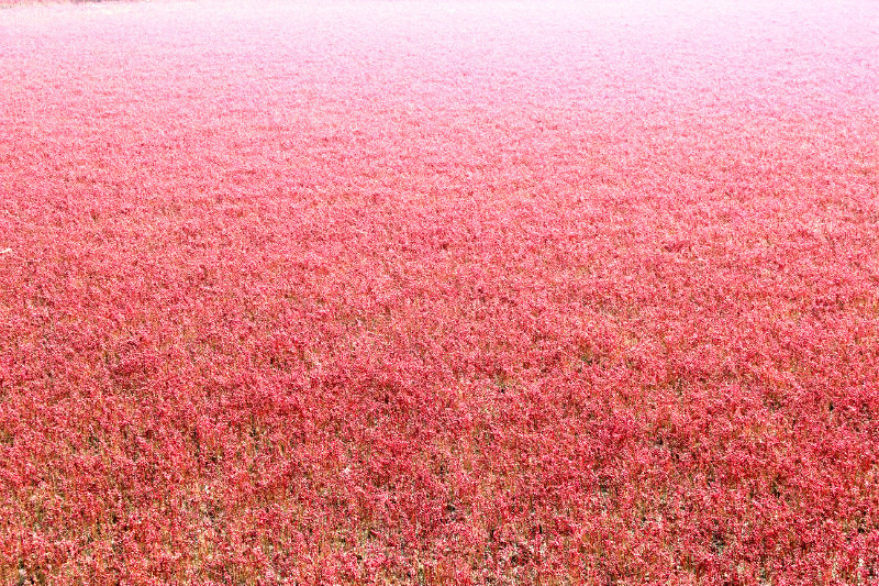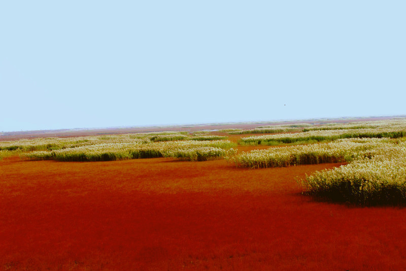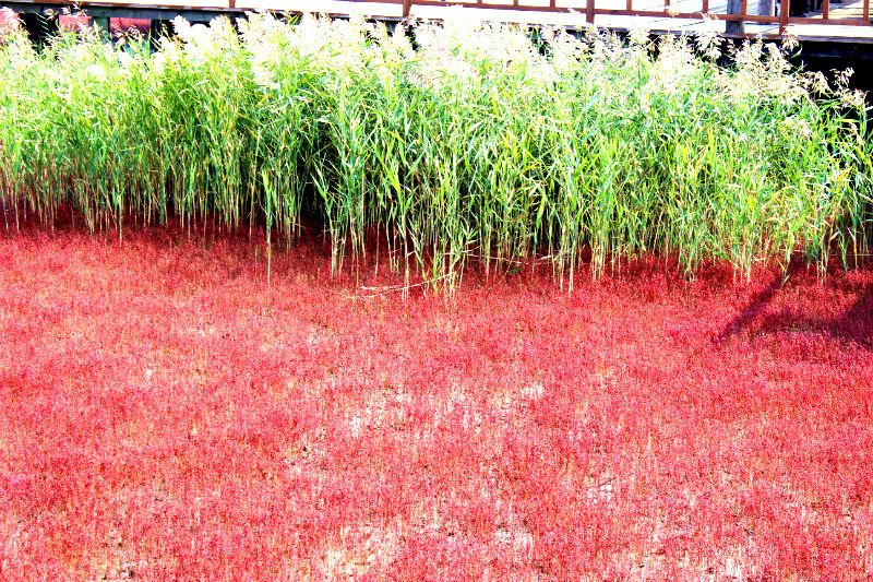 织就盘锦 红海滩 的是一棵棵纤弱的碱蓬草--即一种适宜在盐碱土质--也是惟一一种可以在盐碱土质上存活的草。正常年份3月上中旬至6月上旬都可出苗,出土子叶鲜红,7~8月为花期,9~10月为结实期,11月初种子完全成熟。深秋成熟时植株火红,热烈如火,鲜艳欲滴。 据说六十年代,滩边的渔民村妇曾采来碱蓬草的籽、叶和茎,掺着玉米面蒸出来红草馍馍,几乎拯救了一整代人。