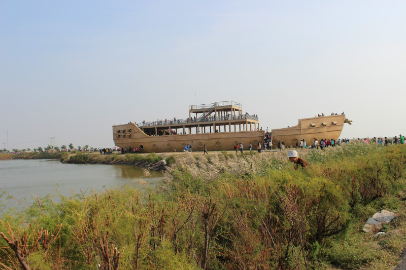 抵达红海滩 码头。这里是全国乃至全球惟一一处在泥滩上建起的木结构、木桩基础、承台式仿古建筑群及纯木制旅游景点。该码头的"九曲廊桥"全长680米,由519根木根木桩支撑,自岸边逶迤而行,直探进海中。木制平台面积高达2000余平方米,由1998根木桩在滩地上傲然拔起,舒展地卧在波涛之上,餐厅、游廊、清吧、茶座错落其间,潮起潮落时,冲击出一派罕见的海上风光。别样的海上休闲,别有一番滋味在心头。