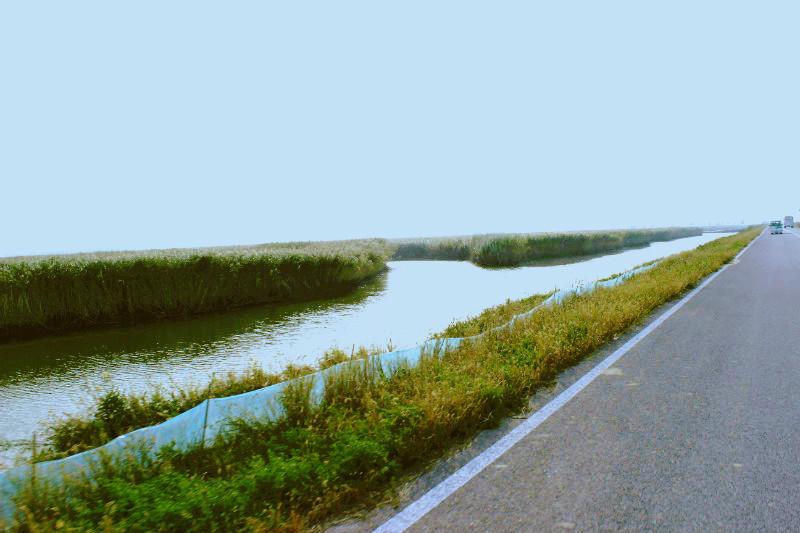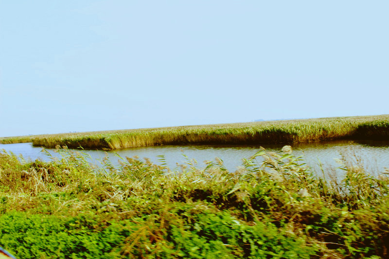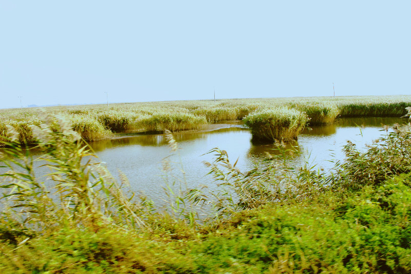 月牙湾湿地公园 ,这是一处美丽的潮间地带,静静立于茫茫苇海之间,被柔软的水流切割成优美的弧线,形成酷似月牙,故名“月牙湾”。因为时间关系,我们也只能遗憾地错过这个景点。车上抓拍几张,以作纪念。想想要是选择坐船游览期间,感觉必是极好的。看到此番景象,也不得不想起一个人:小兵张嘎!