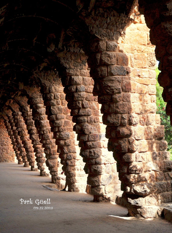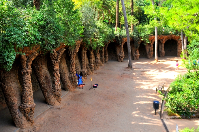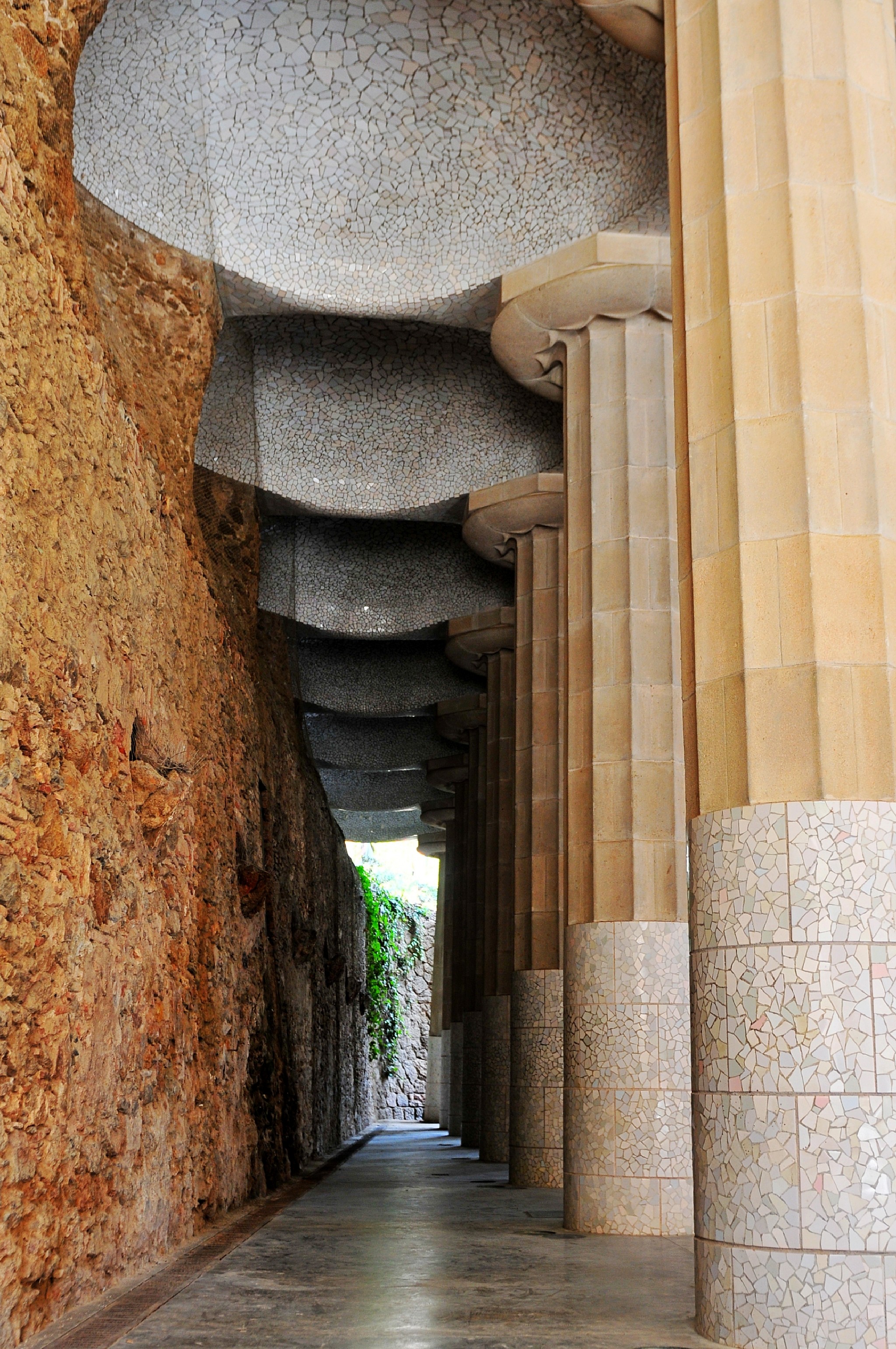 在奎尔公园中,有很多路段都会出现类似自然洞穴的斜柱高架廊。有的分为上下两层,均可走人,其廊柱都为斜立,看似随时都会倾覆却已坚固屹立了近一个世纪,像是有意向人们展示着斜柱和支柱的力学实验对比。