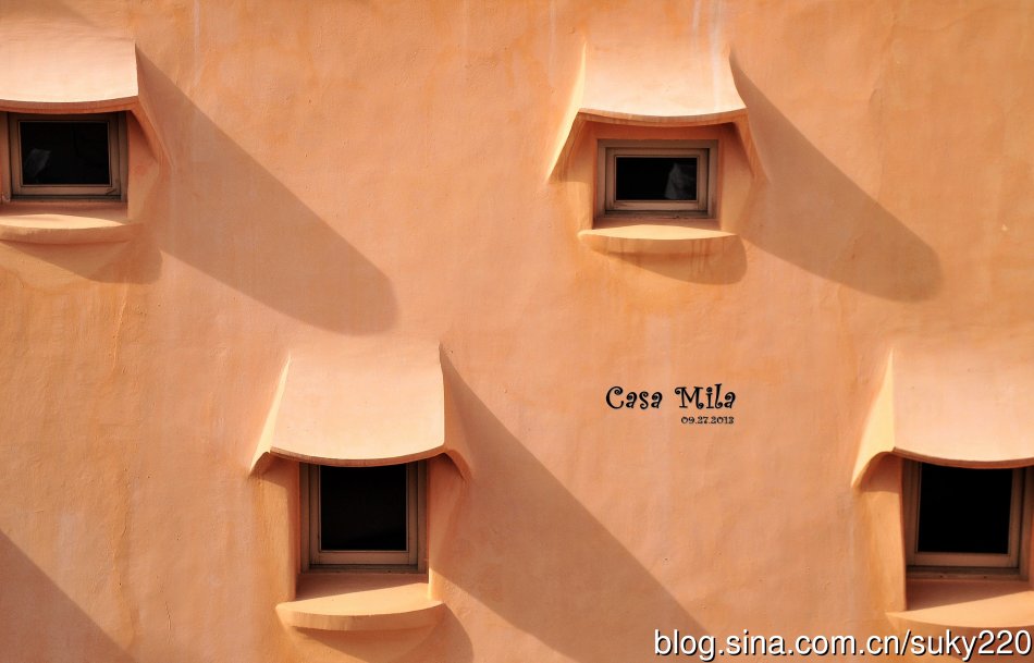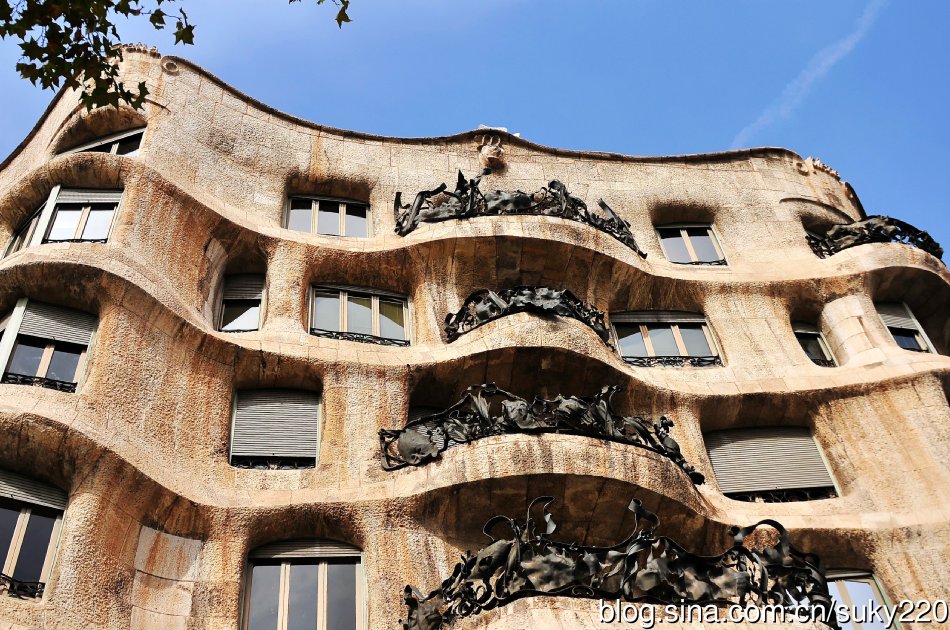 米拉之家波浪的外观,是由白色的石材砌成,扭曲回绕的铁条和铁板构成的阳台栏杆和宽大的窗户的组合,让人觉得像非洲原住民在峭壁的悬崖上所建造类似洞穴的住宿;像蜂窝的组织;像沙丘;像熔岩构成的波浪等,总之高迪的设计可以让每个人都可以尽情的发挥想象力。