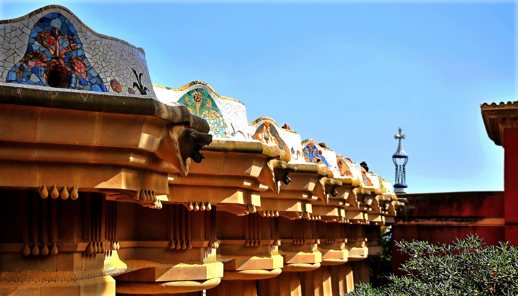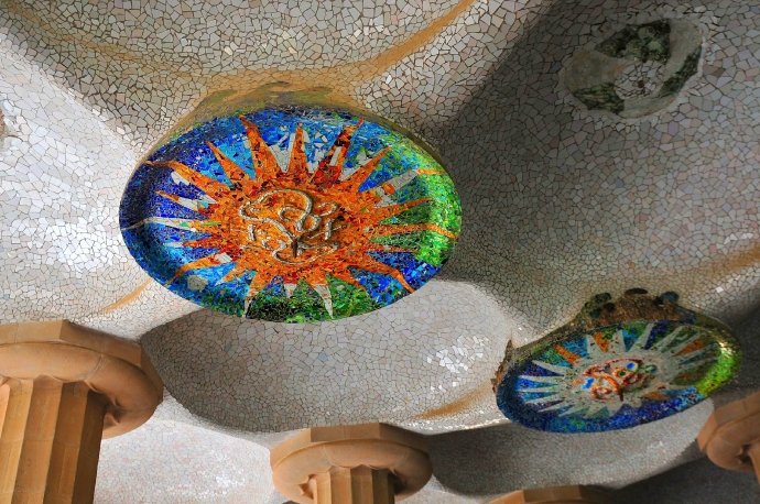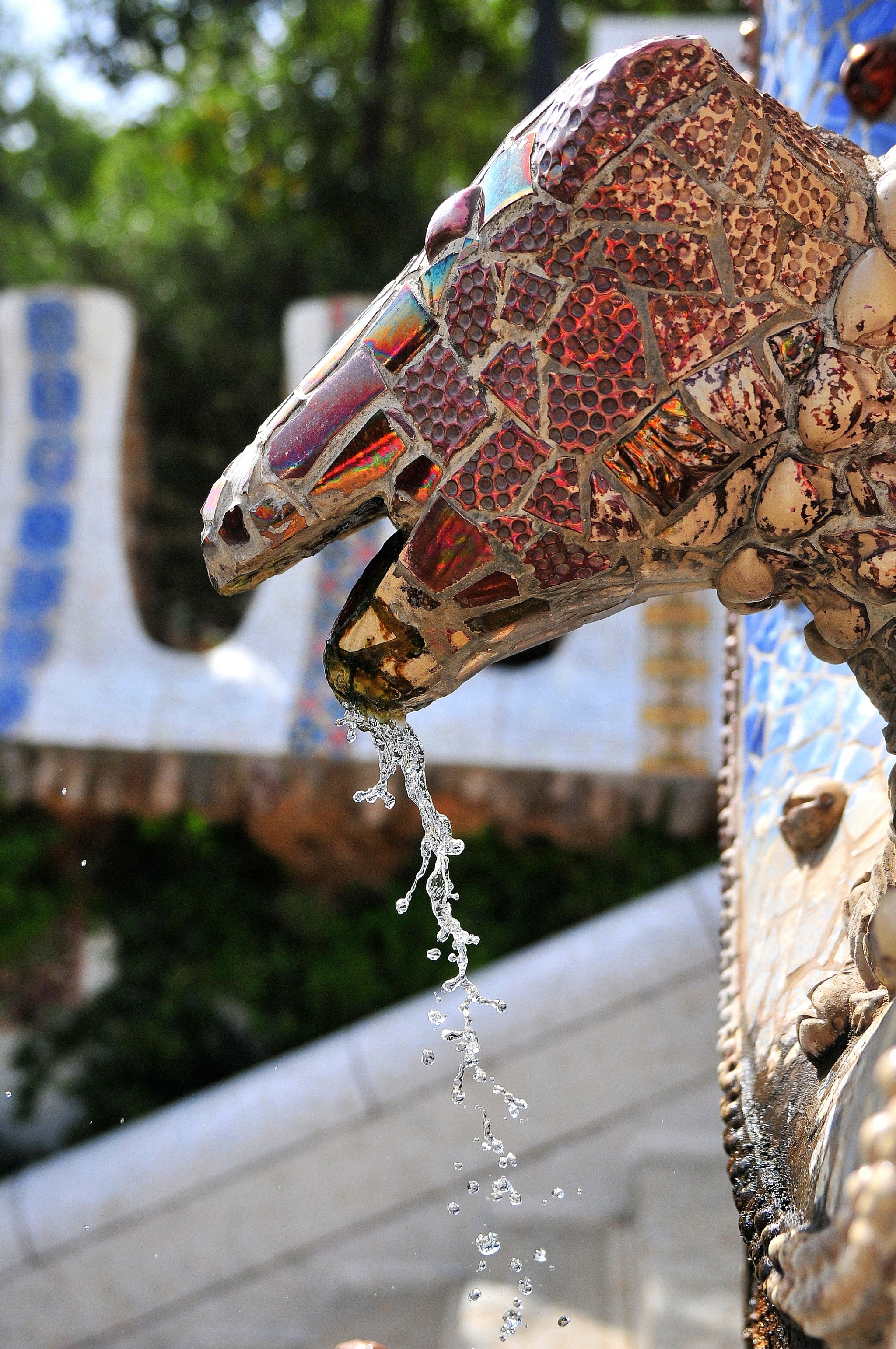 在公园的入口处有两座造型奇异的喷泉,一座是代表加泰罗尼亚的守护神“变色龙”,另一座是加泰罗尼亚的徽章“巨型蜥蜴”。表面都采用马赛克瓷片拼成,色泽艳丽造型生动。除了作为公园的主题象征和镇园之宝外,它们还兼有重要的排水功能。
