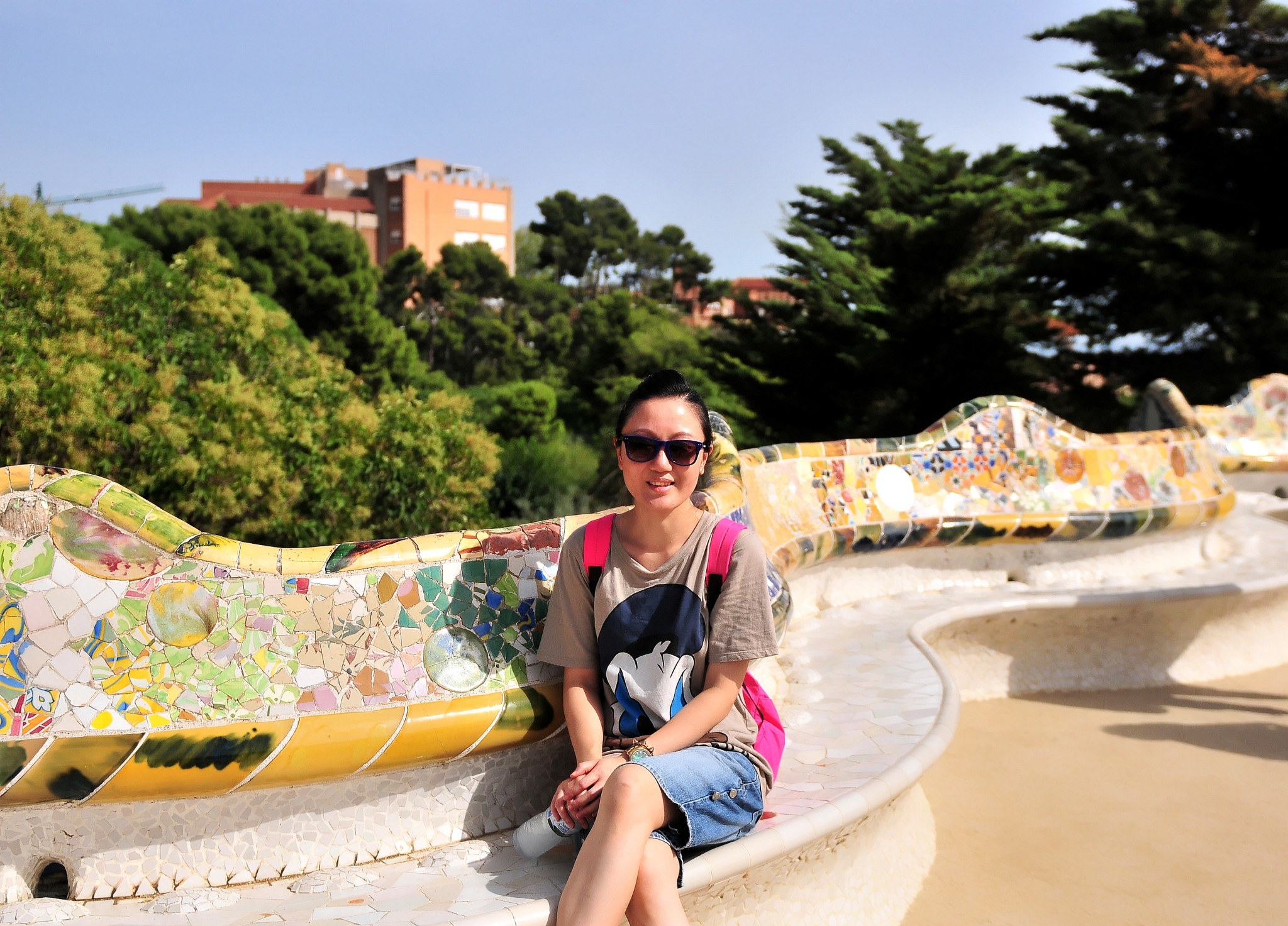 百柱厅的屋顶上是著名的圆形大广场。这里有堪称世界第一长度的座椅。长椅用石头砌成,形似波浪蜿蜒曲折,表面用马赛克碎片随意拼贴,图形各异且隐含寓意。长椅根据人体力学设计,靠背弯度恰到好处,让人坐在坚硬的石椅上却感到十分惬意。长椅的内弧单人座,外弧为情侣座,增添不少情趣。