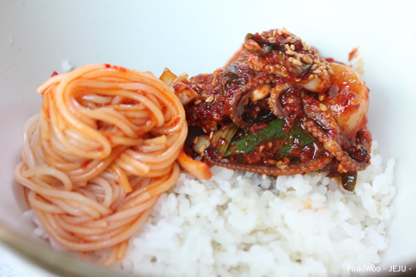 一勺八爪鱼,一勺面,一口饭,拌在一起。