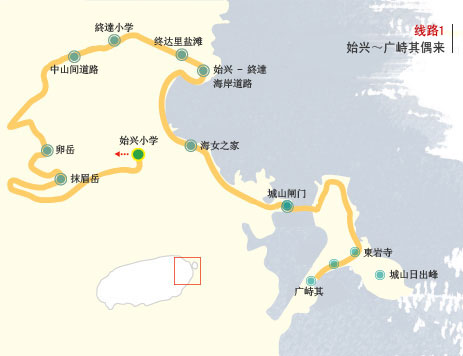 始兴 小学-> 抹眉岳(2.9km)-> 卵岳(3.8km)-> 中山 间道路-> 终达里盐田 (7.3km)->始兴海女之家-> 城山闸门(12.1km)-> 广峙其海岸