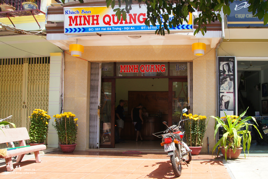 30↑到达会安的第一天是早晨六点,坐了一夜的OPEN BUS身心俱疲又不幸扭伤了脚,沿街旅馆全都客满,一瘸一拐走到这间MINH QUANG HOTEL门前时,店里一位白衣MM关切的喊住我说早上不容易找旅馆,让我先在门口坐一下,七点左右会有人退房。