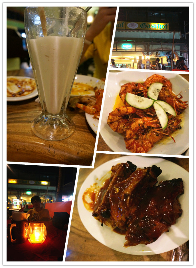 解决晚饭的时间又到了,来到了沙滩边的一家叫gasthof的店,可以坐在沙滩边吃饭,点了一份招牌BBQ,一份奶油柠檬虾,虾子是这种大明虾。一杯椰子沙冰,一杯香蕉沙冰。