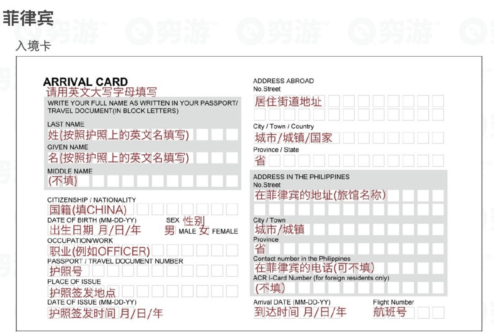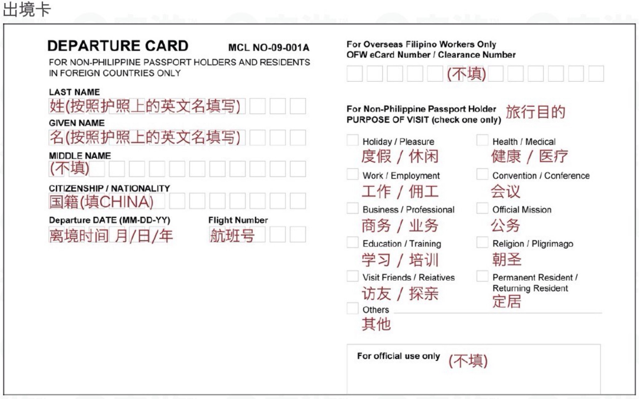 7,飞机上要填入境卡,模式如下。记得名字什么的要大写。