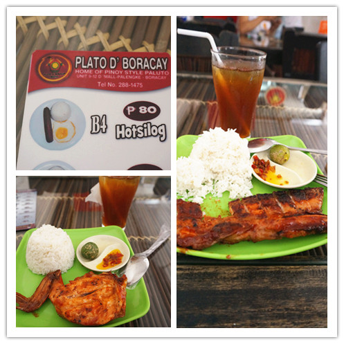 实在是饿极了,连续12个小时没吃东西,我和老公放下东西就急忙出门觅食,随便找到一家PLATO'D BORACAY 在main road进dmall 的路上也是我们这些天吃的最便宜的一餐,因为太饿了,觉得这里的饭菜格外好吃。我点的烤鸡套餐,老公点的熏猪肉套餐,他的好吃些,因为猪肉外面一层的酱料有点甜甜的,两个人花了150p(PLATO'D BORACAY人均RMB 16)