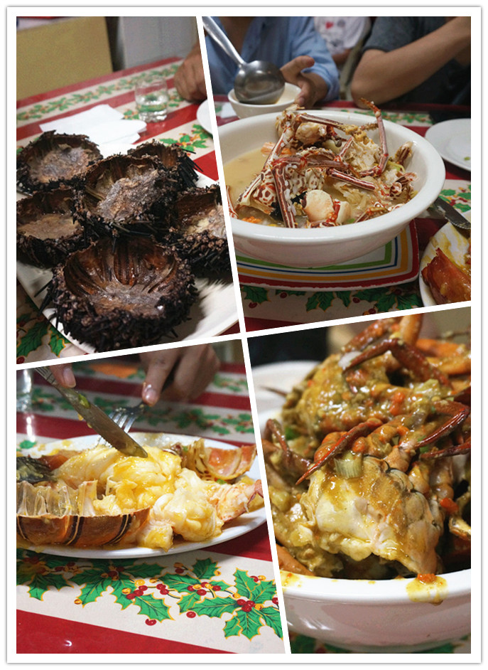 约定的时间到了,6个人一起去dtalipapa吃海鲜咯~又可以吃到大龙虾了好激动!依旧还是去光顾那家AQUAFRESH,这次尝试了新的烹饪方法,龙虾采用了奶油蒜蓉,和芝士焗龙虾一样赞。依旧是龙虾头泡饭,美味极了。螃蟹做咖喱的,没有昨天的辣椒酱味道好。这次买了鱿鱼,这里的鱿鱼很Q很便宜,是做的铁板鱿鱼味道不错。还有海胆,蒸蛋来着,但是个人不喜欢海胆的苦味,这里的烹饪和国内的不太一样,主要是因为海胆的苦味很重。一个大龙虾加4个母蟹4300p,鱿鱼320p一条,石斑鱼400p一条,海胆100p一个买了7个,再加上加工费,喝了点小酒,每个人平均200RMB.