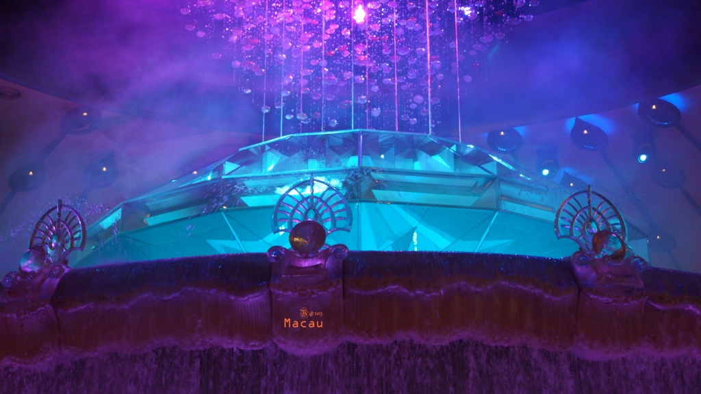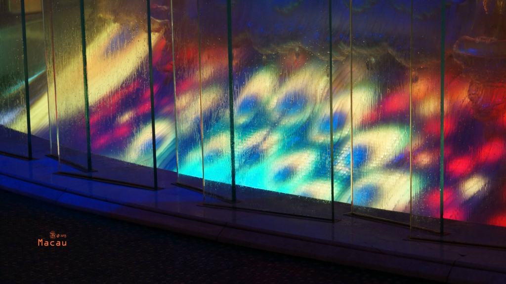正在我发呆这阵,中庭的水帘升起,一场灯光秀即时上演。视觉享受。赞!