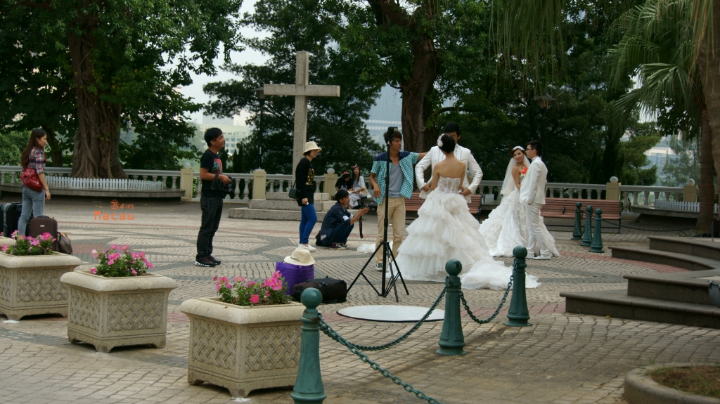在教堂前拍照的新人,这里也是澳门的婚姻登记处