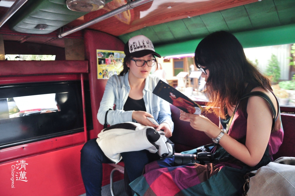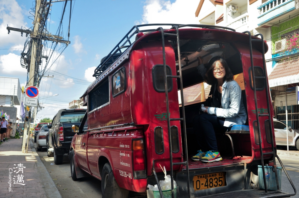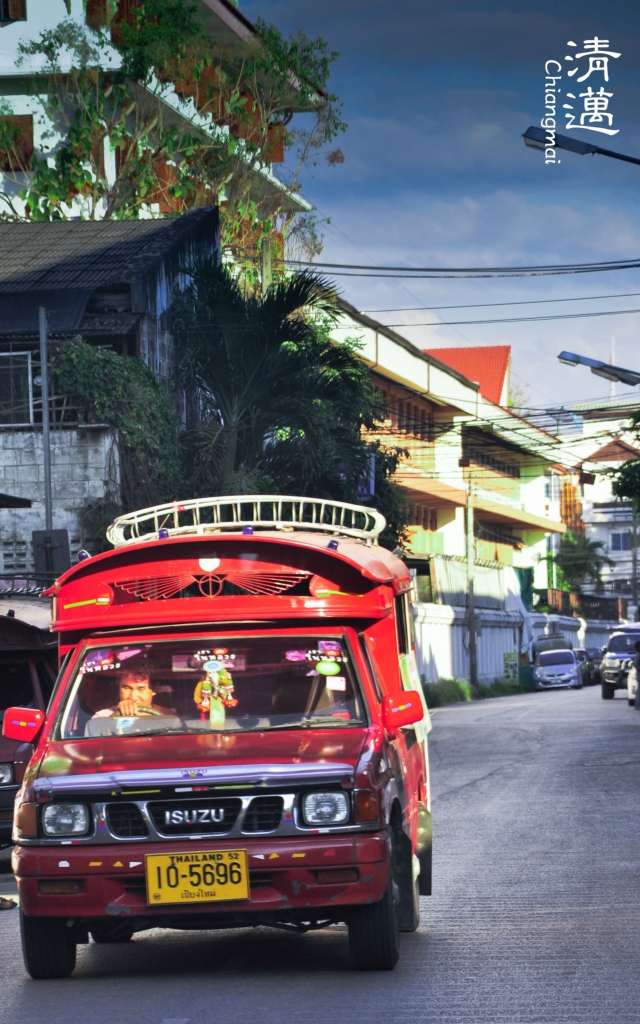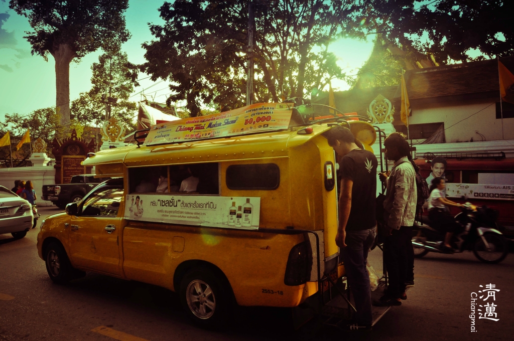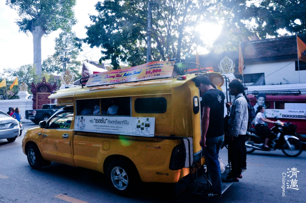 双条车:双条车是清迈 主要的交通工具,随叫随停,价钱从20B-不等,看距离收费。我们坐过最贵的一次是从老城到素贴山 ,100B一人。双条车有六种颜色,红色是市区的,黄色是往宗通 、媚林等 蓝色是往沙拉 匹,橙色是往枋,白色是往散甘平,绿色是往珊宝,我们4天都是坐的红色双条。