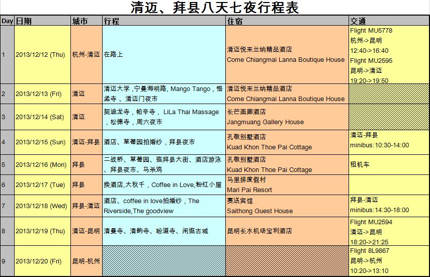 【交通】机票,亚航?NONONO!我们从来就没有抢到亚航特价票的命,提前一个月订了某网站的机票+清迈2晚酒店的自由行套餐2800RMB/人,包含了8天的保险。东航的飞机,杭州飞昆明中转去清迈,虽然中转耗去了不少时间,但这已经是LZ看到的最便宜的价格了,为了省钱,咱忍了!更何况之前杭州本就没有直飞清迈的班机啊!最近亚航才刚开通这条航线,价格灰常诱人,省钱又省时,捶地啊!