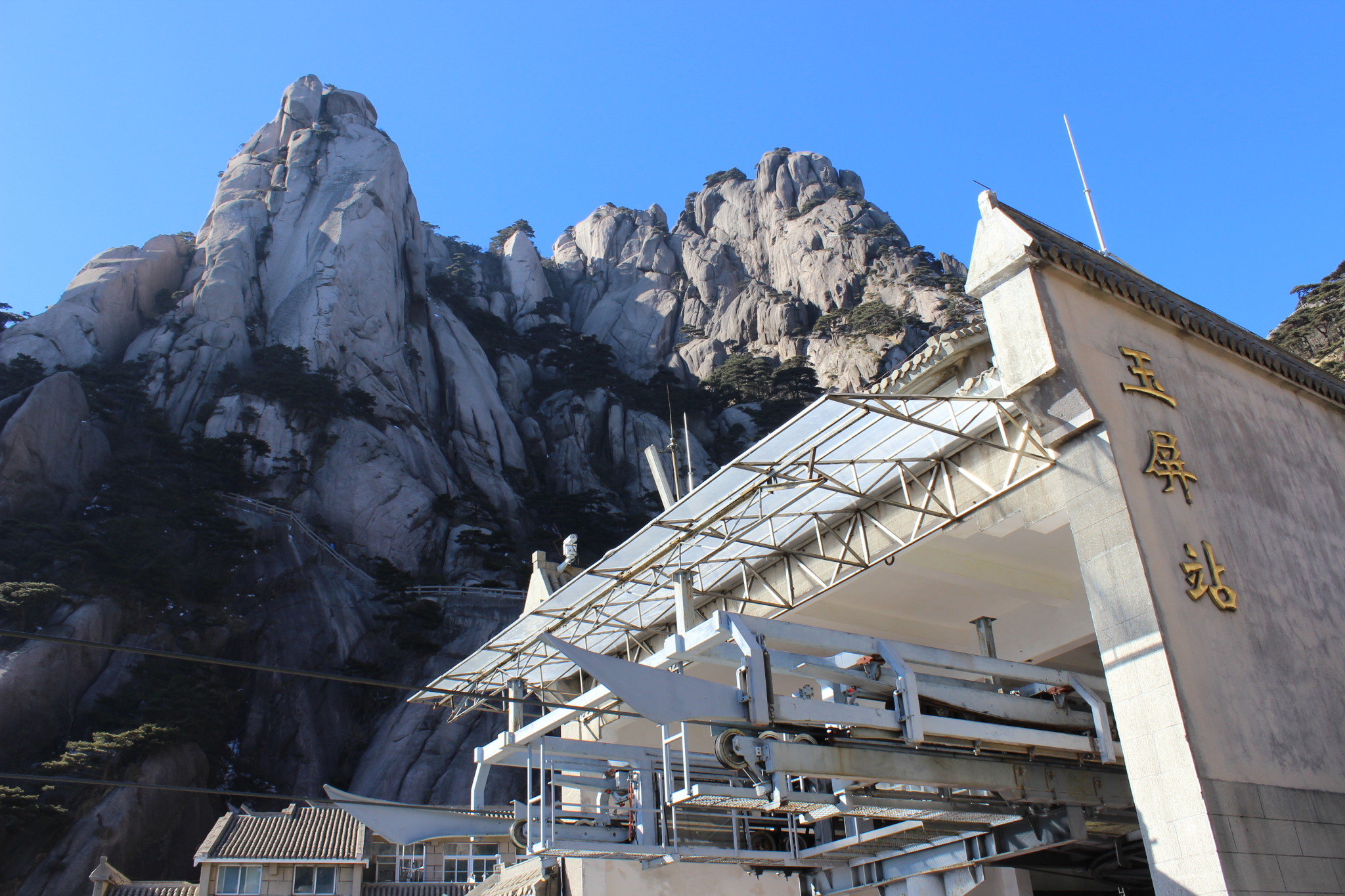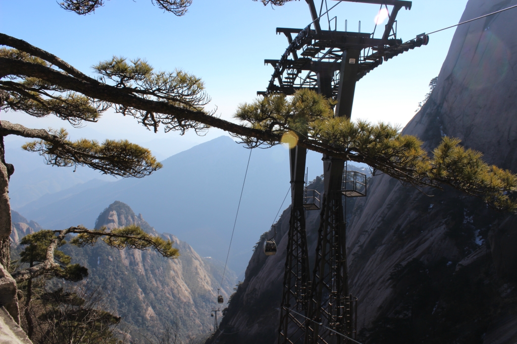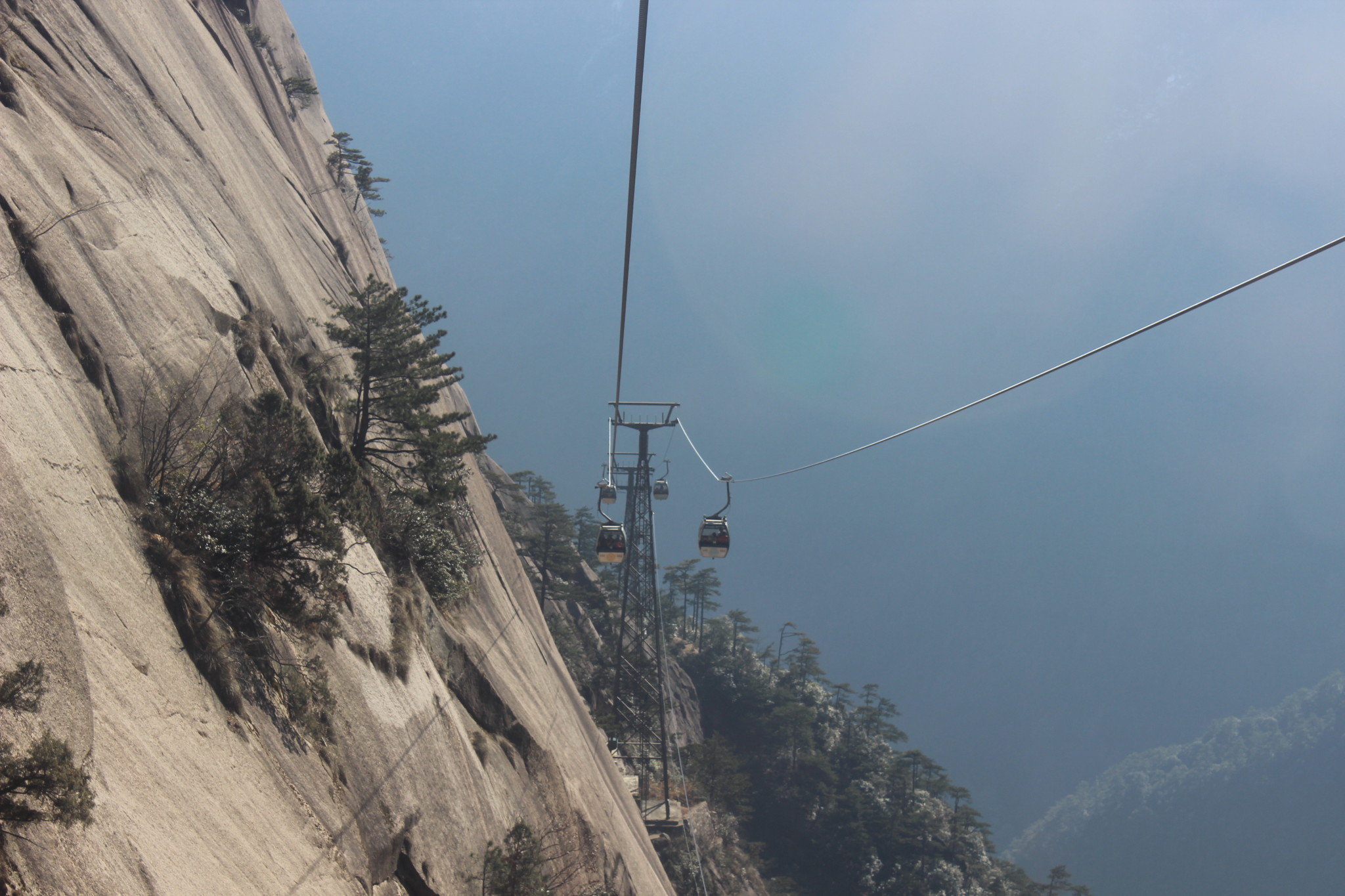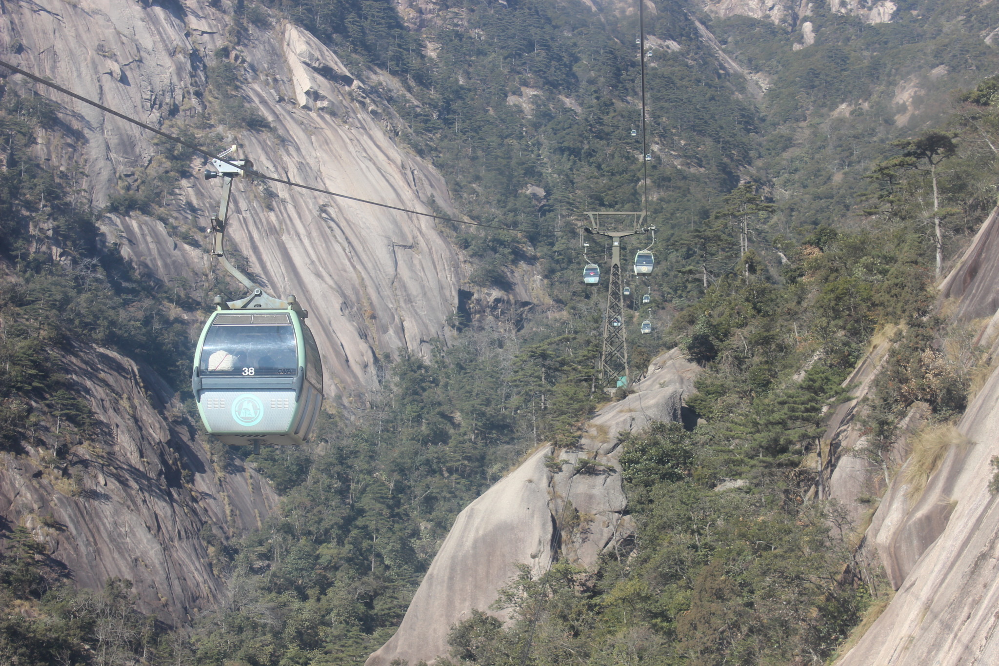 黄山 的缆车不同于别的山峰,缆车的爬行坡度是比较夸张的,下面就是万丈深渊,相当惊险刺激,所以有恐高症的朋友别往下看,忍个10分钟就到了,玉屏索道的缆车是6人一辆,循环不间断上下山,所以淡季经常会看到只有2个人的缆车或者空车,后山的云谷索道缆车可以乘很多人,下面就发一些在缆车上面拍摄的图片,大家可以自己感受一下,但是缆车其实是相当安全的,所以不要有过重的心理负担,就当是在乘飞机,尽情享受壮观的景象