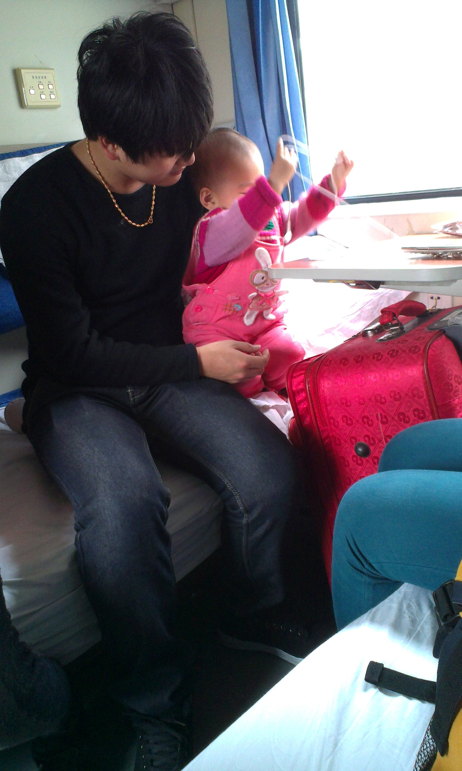 1.10 在火车上遇到超级有爱的一家人。宝宝自己会乖乖地喝nei nei,还和粑粑一起看动画儿歌。麻麻肚子里还有个baby。