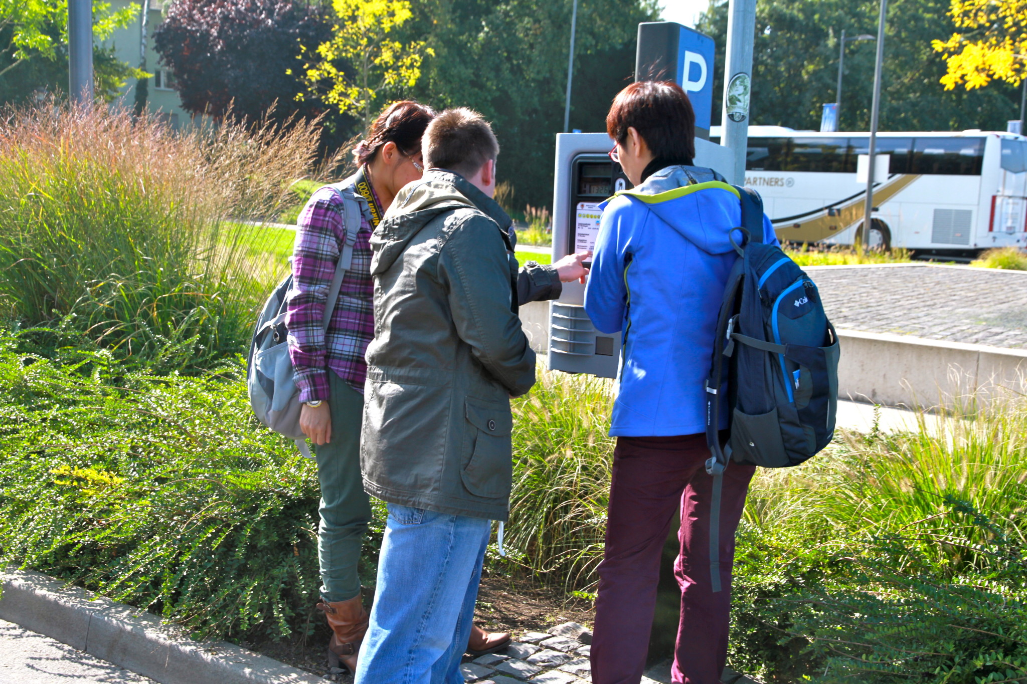 热心的德国朋友讲解如何操作自助收费机,有时候机器不一样,语言不一样,需要请教哦。