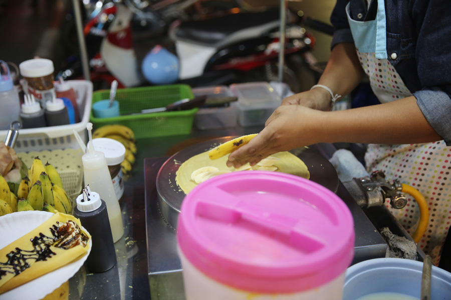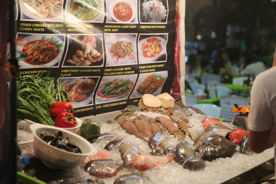 海鲜很新鲜,感觉也不算便宜,点了只龙虾,6两多,讨价还价1100铢成交,吃个大排档花了3600铢,香蕉饼是泰国的特色小吃。